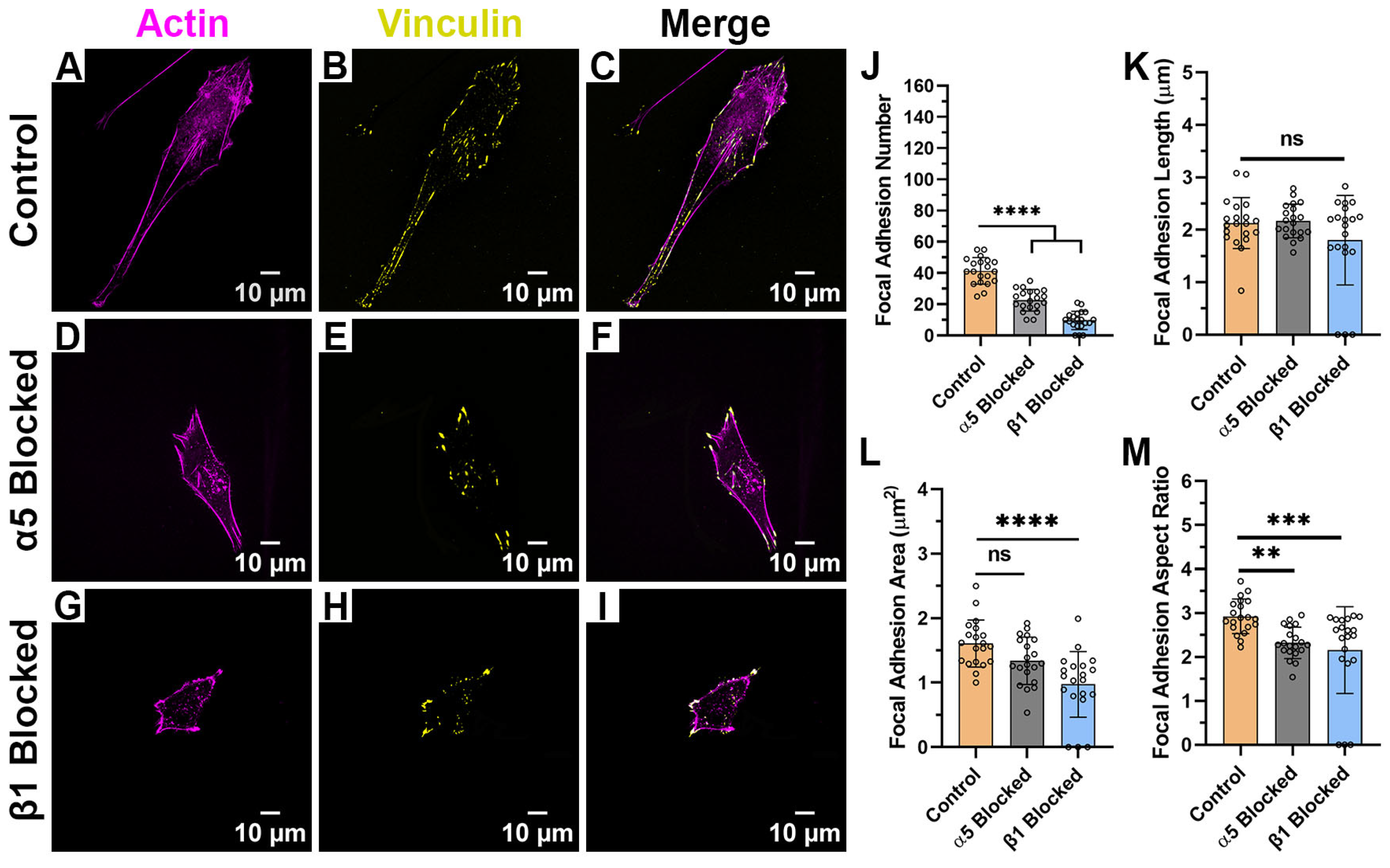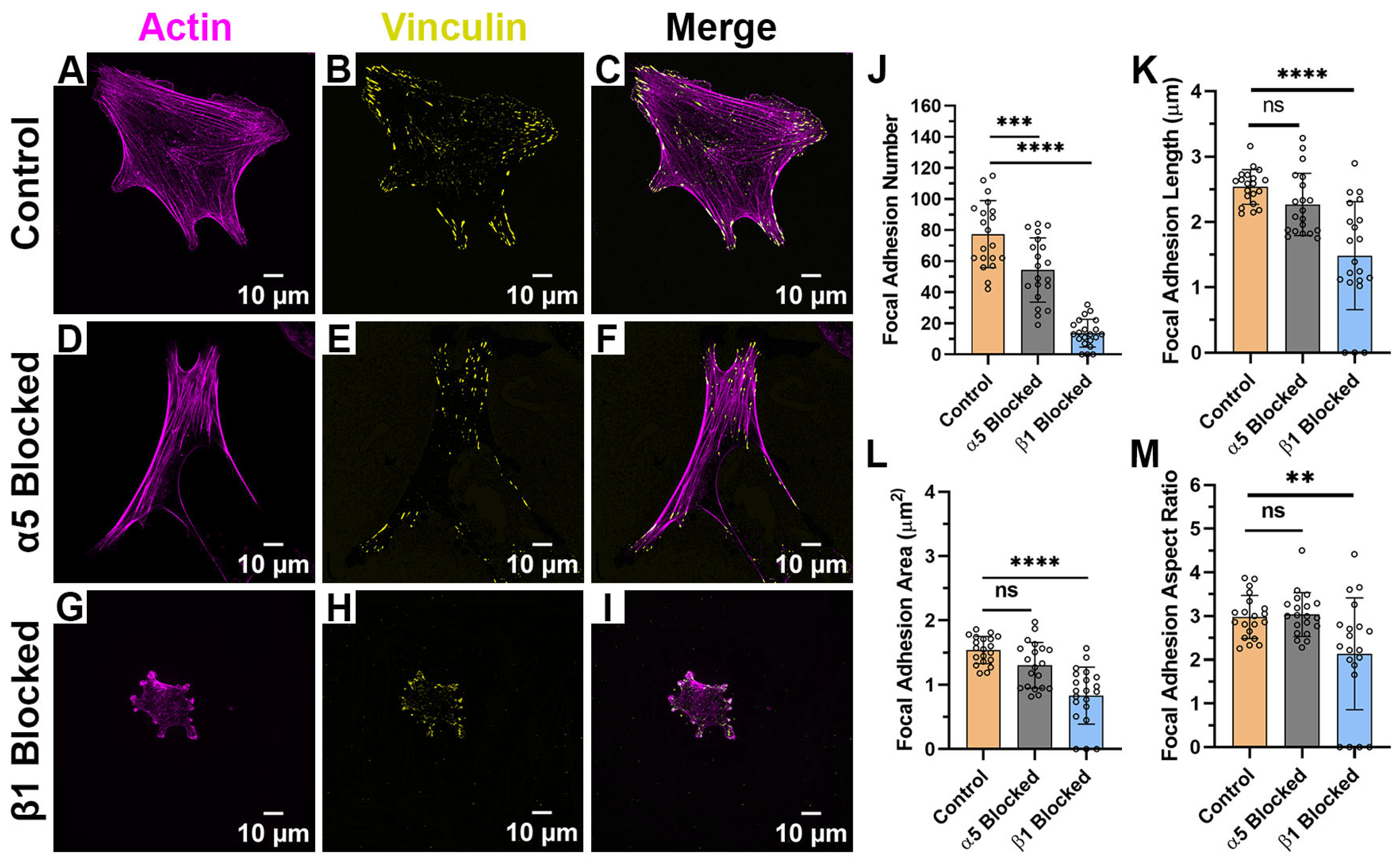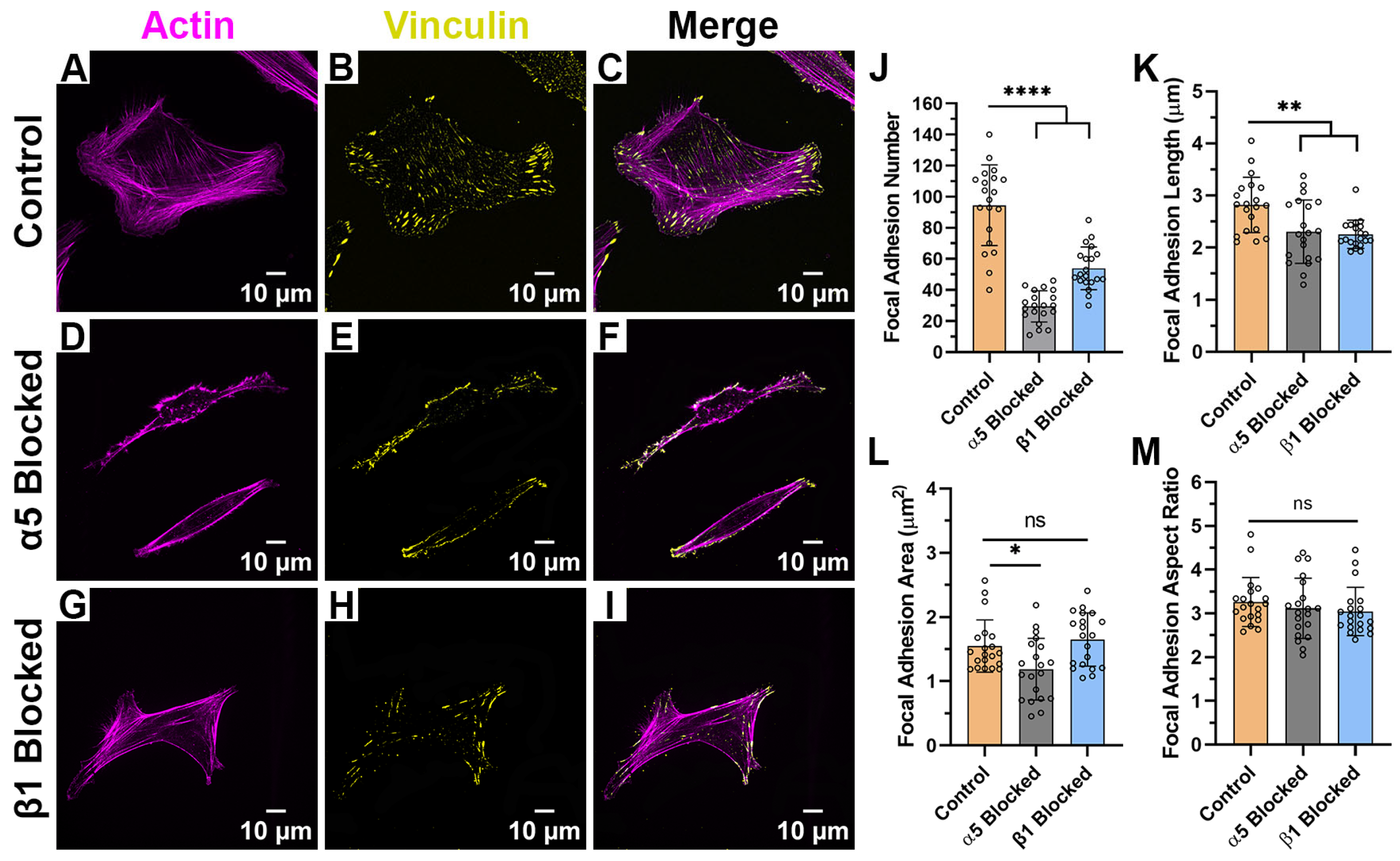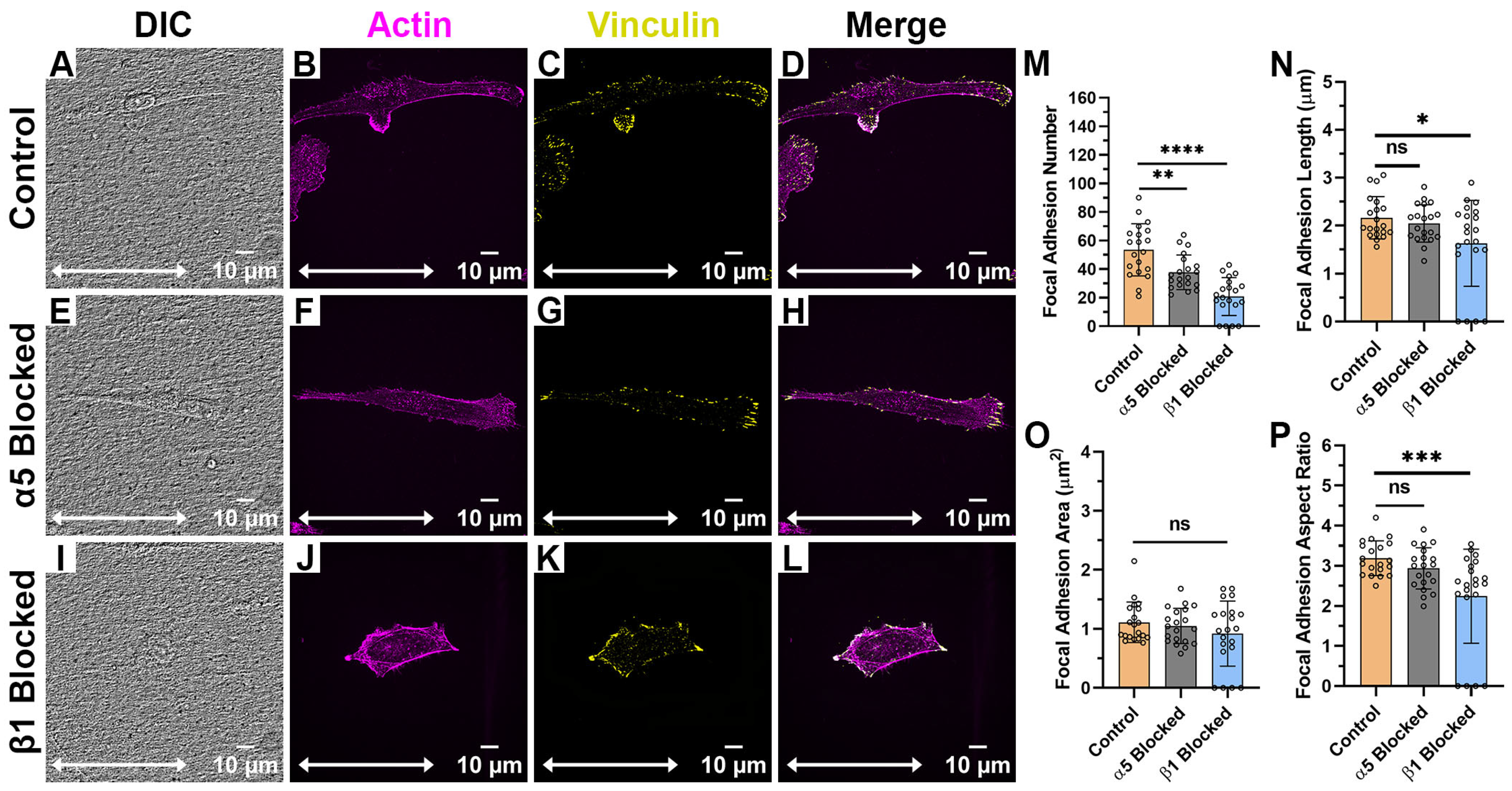 | Focal Adhesion Morphology | Control (Average ± SD) | α5 Blocked (Average ± SD) | β1 Blocked (Average ± SD) |