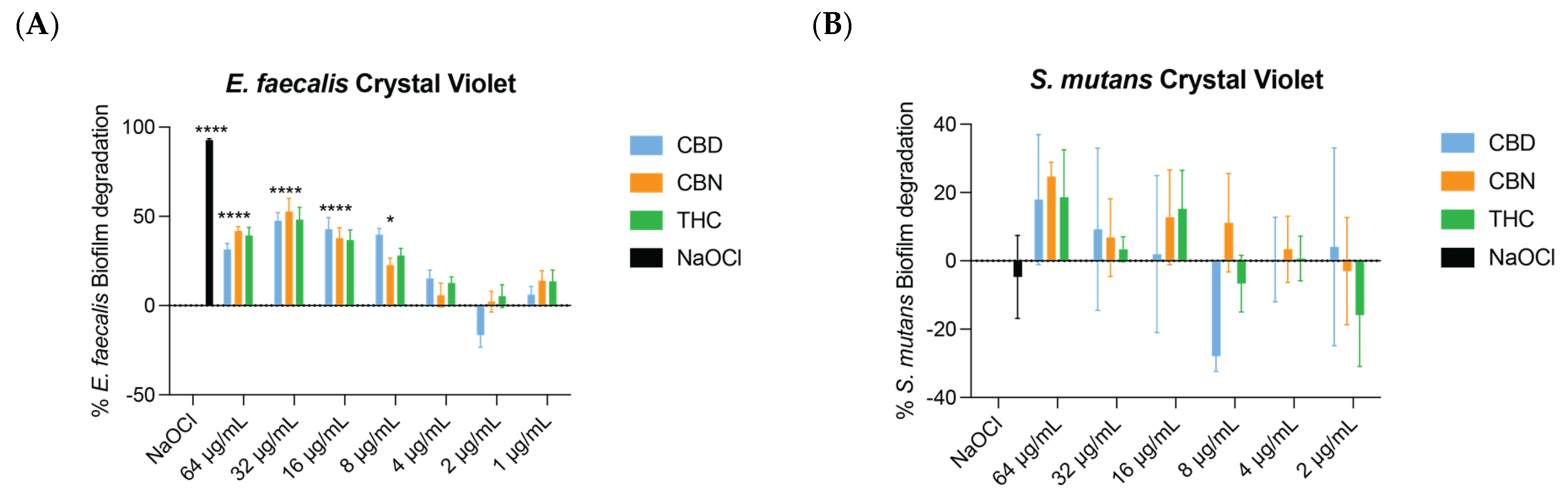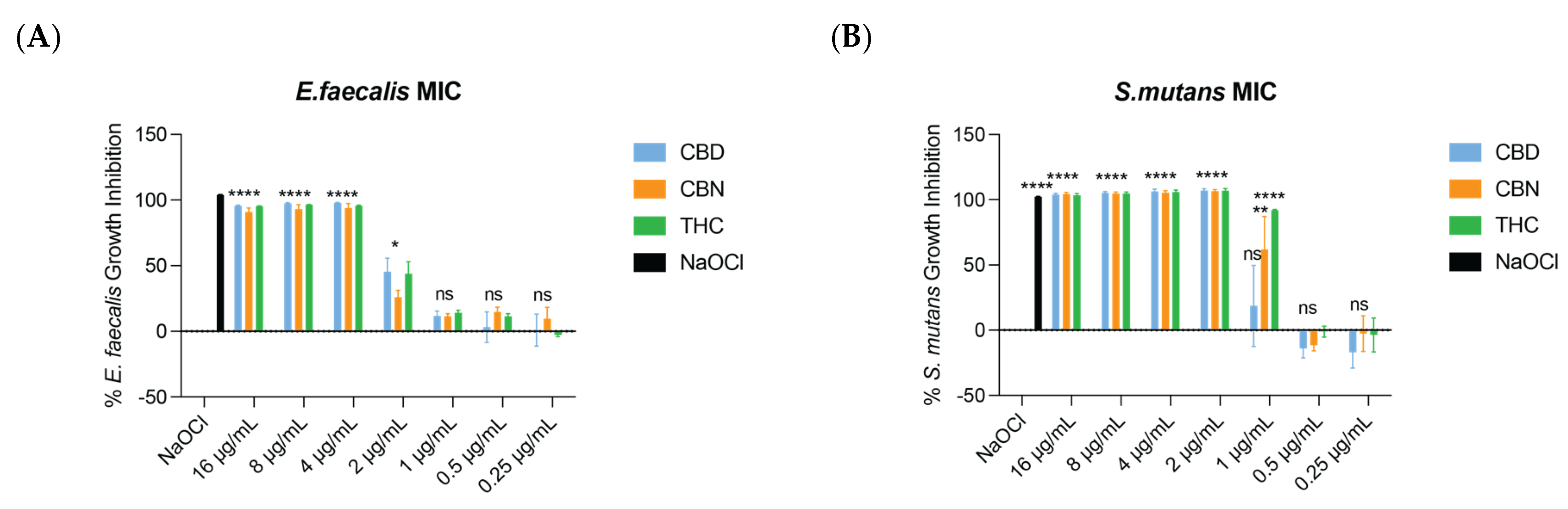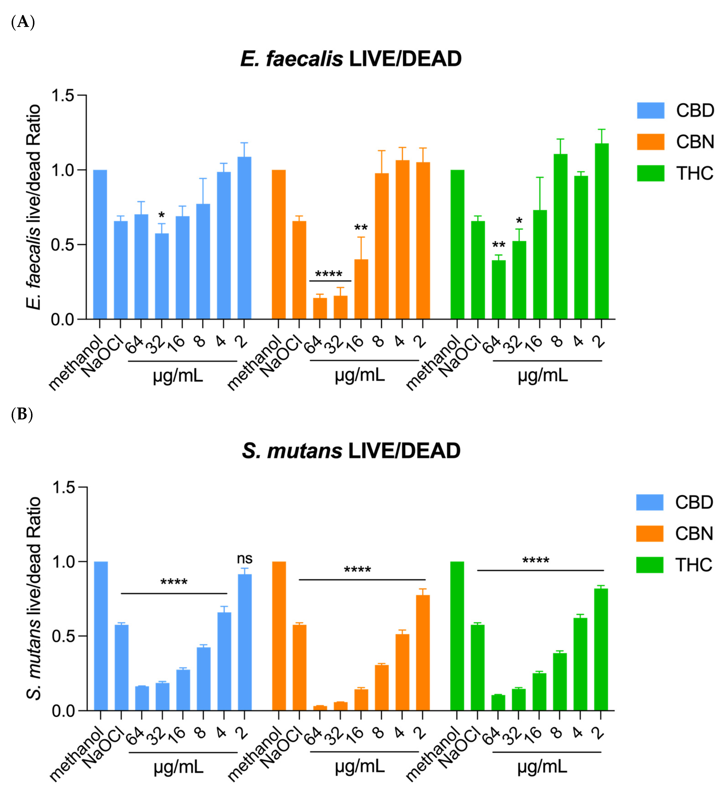 2.2. Minimum Bactericidal Concentration (MBC) of CBD, CBN, and THC Against E. faecalis and S. mutans