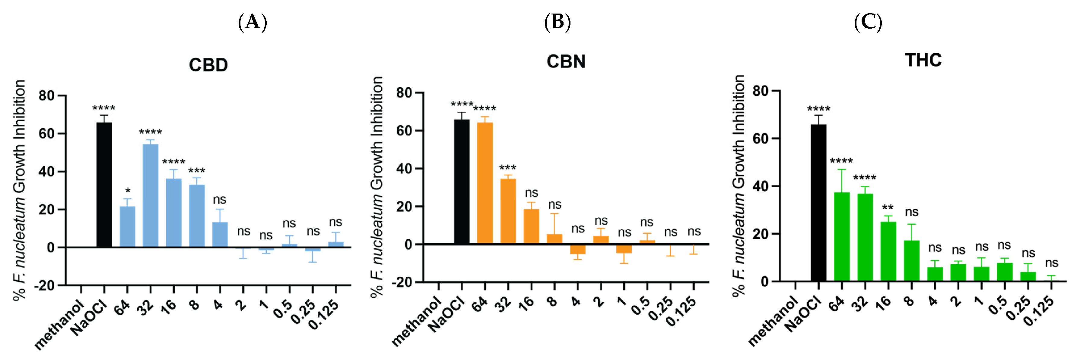 2.1. Minimum Inhibitory Concentration (MIC) of CBD, CBN, and THC Against E. faecalis, S. mutans, and F. nucleatum