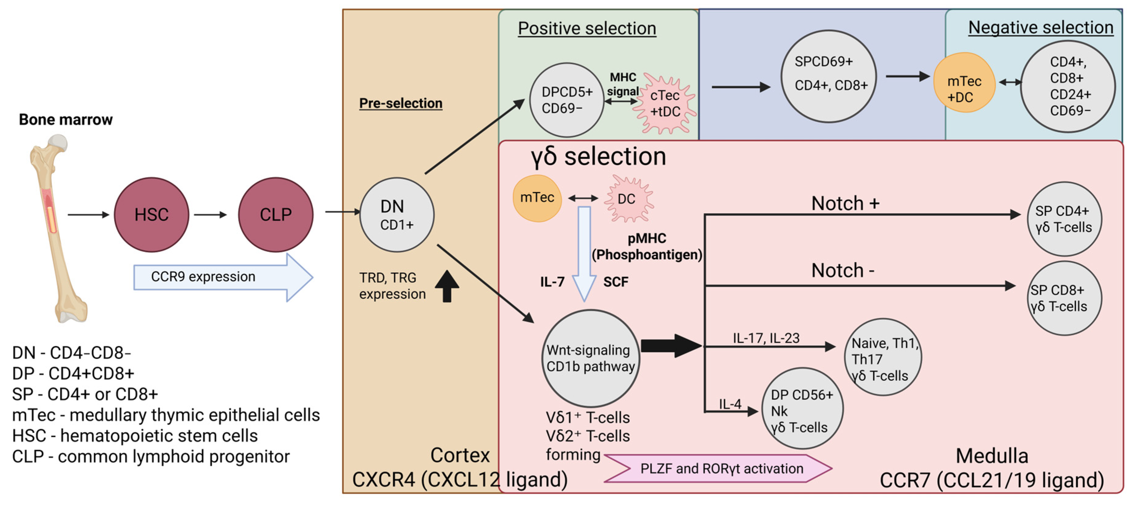 Figure 2. The process of thymocyte proliferation into γδ T cells. Unlike αβ T cells, γδ T cells undergo selection with increased expression of the TRD and TRG loci, which determine the fate of T cells along the γδ lineage. During selection in the triad between mTEC, tDCs and thymocytes, antigen presentation and signal induction from TCR via TFC-1 Wnt signaling via the CD1d-dependent pathway occur, during which, upon induction of transcription factors, γδ T cells differentiate into various subpopulations.