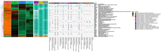Heatmap featuring hierarchic clustering of differentially expressed genes in 48, 96, and 144 h of experiment compared to control (0 h). Dark dots represent genes from the most significantly enriched ontological groups based on the lowest adjusted p-values. Expression values are scaled by rows and presented as colors and range from orange (low expression) to green (high expression).