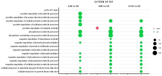 The overrepresented gene sets in DAVID GO PB DIRECT annotations database illustrated as a bubble plot, derived from comparisons in gene expression profiles between 48 h, 98 h, and 144 h vs. control (0 h). Only the GO groups above the establisher cut-off criteria (p with correction < 0.05, a minimal number of genes per group > 2) are depicted as color bubble. Each bubble’s size corresponds to the number of differentially expressed genes associated with the GO biological process terms. The transparency of the bubble represents its p-value, with greater transparency indicating proximity to the p = 0.05 cut-off value. Green bubble represents overexpressed genes, while red bubbles signify downregulated genes.