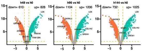 Furthermore, the gene ontology (GO) biological processes analysis revealed 8 of 17 processes to be significantly impacted during all time points that were evaluated (Figure 2). The highest number of enriched genes were noticed for phosphorus metabolic, phosphate-containing compound metabolic, and positive regulation of cellular protein metabolic processes. The analysis revealed only one suppressed process for 96 h of experiment, compared to control, which was positive regulation of catalytic activity. The volcano plots for the overall analysis, representing the relationship between statistical significance (p-values) and fold changes for each gene (Figure 3). For the analysis of 48 h of the experiment, 610 downregulated and 828 upregulated genes compared to the control group were revealed. The most inhibited genes were GARLN3 and ARRDC4, while the most activated were ANXA8, SLC1A1, FAM129A, and GREM1. The comparison of 96 h of experiment to control showed 1104 inhibited (GARNL3, and ARRDC4), and 1206 activated genes (LOX, COL1A2, ANXA8, and GREM1). Analysis of the last time point (144 h) indicates 732 inhibited (GARNL3) and 1025 enhanced genes (LOX, COL1A2, NR2F1, ANXA8, and GREM1). To summarize, in all analyzed time points, the expression of LOX, ANXA8, and GREM1 was enhanced, while the expression of GARNL3 and ARRDC4 was suppressed.