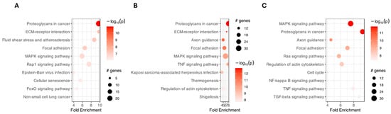 PathfindR was used to identify enriched pathways and active subnetworks in a protein–protein interaction network (Figure 4 and Figure 5). We indicate that in all analyzed groups, the term “proteoglycans in cancer” was enriched (Figure 4). Furthermore, the “MAPK signaling pathway” had the highest number of involved genes across all analyzed groups. Additionally, the connections between terms and significant genes were explored to gain deeper insights into the complex relationships and regulatory networks within the biological processes identified in the preceding analysis (Figure 5).