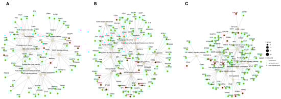 The graph illustrating term–gene relationships for significant genes associated with enriched terms at 48 (A), 96 (B), and 144 (C) hours of the experiment compared to the control. Node sizes are proportionally plotted based on the number of genes within a term, with node color indicating upregulated genes (green) and downregulated genes (red).