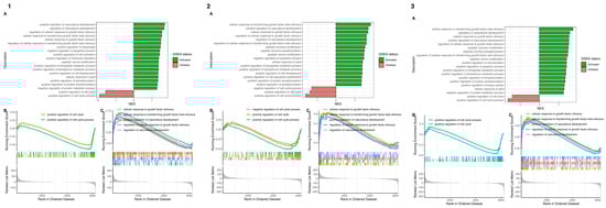 Gene Set Enrichment Analysis (GSEA) for cells at 48 (1), 96 (2), and 144 h (3) in comparison to the control. (A) The normalized enrichment score (NES) is depicted as a bar plot, indicating the enrichment of a gene set at the top of a ranked list (green indicators), while gene sets with a negative NES are overrepresented at the bottom of the gene list (red indicators). (B,C) Elaborate enrichment plots showcase the profiles of the leading ES score and the positions of genes on the rank-ordered list for the top five inhibited/activated gene sets.