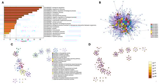 A comprehensive functional enrichment analysis, using the Metascape platform (Figure 7), identified overrepresented biological terms across all DEGs. In total, 19 top statistically enriched GO terms were identified. Among these, the top five enriched processes were biological regulation (GO:0065007, log10(P) = −62.65); response to stimulus (GO:0050896, log10(P) = −57.80); positive regulation of biological processes (GO:0048518, log10(P) = −54.78); metabolic processes (GO:0008152, log10(P) = −46.91); and locomotion (GO:0040011, log10(P) = −40.43) (Figure 7A). Subsequently, a sophisticated clustering algorithm was employed to cluster similar functional terms, to identify cohesive functional clusters within the enrichment results. These findings are presented in a network layout (Figure 7B–D), facilitating identifying related biological processes and pathways that may share common underlying mechanisms. The current analyses validated the results and reveal comparable biological processes (GO BP) with equivalent statistical significance.