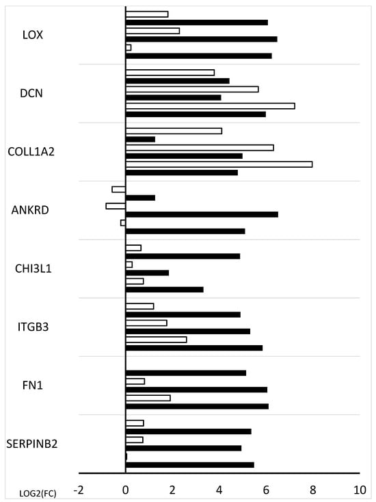 The microarray data were quantitatively validated using the RT-qPCR technique. For RT-qPCR validation, cultures were maintained in three biological replicates for each corresponding time interval. A bar chart was created using the RT-qPCR assay data (Figure 8). The microarray analysis results are depicted in the figure’s black bars, while the quantitative validation is shown in the white bars. Notably, the expression direction of 8 genes was measured, with only one gene, ANKRD, displaying a change in expression direction that differed from the microarray findings. This discrepancy may be due to different transcript variants present in the microarray compared to those used in the RT-qPCR primer design. The RT-qPCR result is considered more reliable because all available transcript variants of the ANKRD gene were used for primer design. Additionally, RT-qPCR is a more quantitative method compared to the qualitative method of the microarray method.