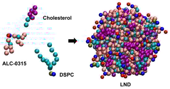 CG structure of an LND containing ALC-0315, DSPC, and cholesterol.
