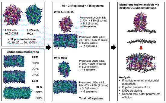 Additionally, to aid in understanding a realistic LNP endosomal escape mechanism, we designed LNDs and endosomal membranes that reflect critical characteristics such as pH changes and compositional changes in the endosomal membrane during endosomal maturation along the endosomal and lysosomal maturation pathway. To account for changes in the fraction of protonated ILs within LNDs due to the pH variations inside the endosome, we designed 11 types of LNDs for both ALC-0315-containing LNDs and MC3-containing LNDs, incrementing the fraction of protonated ILs from 0% to 100% in increments of 10%. Detailed methods of LNDs design are described in Section 3.1.