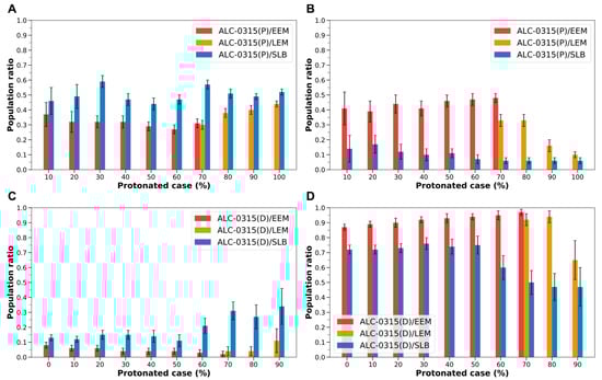 (A) Population ratio of protonated ALC-0315 (ALC-0315(P)) distributed in the outer leaflet during the fusion of ALC-0315-containing LNDs with EEM, LEM, and SLB, shown according to the LNDs’ protonated case. The red bars represent values for ALC-0315(P) fusing with EEM, the orange bars for LEM, and the blue bars for SLB. (B) Population ratio of ALC-0315(P) present in the midplane of the membrane, depicted according to the LNDs’ protonated case. (C) Population ratio of deprotonated ALC-0315 (ALC-0315(D)) distributed in the outer leaflet, shown according to the LNDs’ protonated case. (D) Population ratio of ALC-0315(D) present in the midplane of the membrane, depicted according to the LNDs’ protonated case.