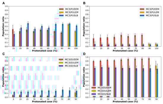 (A) Population ratio of protonated MC3 (MC3(P)) in the outer leaflet during the fusion of MC3-containing LNDs with EEM, LEM, and SLB, based on the LNDs’ protonated case. The red bars indicate MC3(P) fusing with EEM, the orange bars with LEM, and the blue bars with SLB. (B) Population ratio of MC3(P) in the midplane of the membrane, according to the LNDs’ protonated case. (C) Population ratio of deprotonated MC3 (MC3(D)) in the outer leaflet, according to the LNDs’ protonated case. (D) Population ratio of MC3(D) in the midplane of the membrane, according to the LNDs’ protonated case.