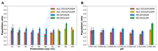 (A) Population ratios of ALC-0315(P) and MC3(P) present in the outer leaflet during the fusion of ALC-0315-containing and MC3-containing LNDs with EEM or LEM, based on the LNDs’ protonated case. Red and orange bars indicate the population ratio for ALC-0315(P) when ALC-0315-containing LNDs fuse with EEM and LEM, respectively. Blue and green bars depict the ratio for MC3(P) when MC3-containing LNDs fuse with EEM and LEM, respectively. (B) Population ratios of ALC-0315(P) and MC3(P) present in the outer leaflet, shown according to the pH of the LNDs. pH values outside the parentheses correspond to ALC-0315-containing LNDs, whereas pH values inside the parentheses correspond to MC3-containing LNDs.