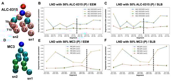 (A) Bead types along the tails of ALC-0315. (B,C) Segmental order parameters of ALC-0315 tails after fusion of LNDs containing 50% ALC-0315(P) with EEM (B) and SLB (C). The left and right sides of the black dashed line represent bond order parameters for consecutive tail bonds and non-consecutive bead vectors, respectively. Blue and orange indicate the sn1 and sn2 tails of ALC-0315(P), while green and red represent the sn1 and sn2 tails of ALC-0315(D). (D) Bead types along the tails of MC3. (E,F) Segmental order parameters of MC3 tails after fusion of LNDs containing 50% MC3(P) with EEM (E) and SLB (F). The color scheme follows that in (B): blue/orange for MC3(P), and green/red for MC3(D).