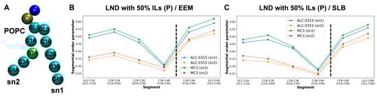 (A) Bead types along the tails of POPC. (B,C) Segmental order parameters of POPC tails after fusion of LNDs containing 50% ILs(P) with EEM (B) or SLB (C). The left and right sides of the black dashed line represent bond order parameters for consecutive tail bonds and non-consecutive bead vectors, respectively. Blue and orange indicate the sn1 and sn2 tails of POPC when the IL is ALC-0315, while green and red represent the sn1 and sn2 tails of POPC when the IL is MC3.