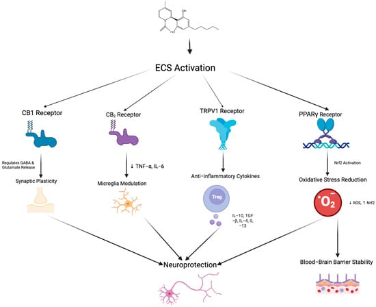 Schematic representation of the potential neuroprotective mechanisms mediated by endocannabinoid system activation through multiple receptor pathways. Arrows indicate the direction of regulatory interactions among receptors, signaling pathways, and cellular responses. Activation of CB1 receptors regulates GABA and glutamate release, contributing to synaptic plasticity. CB2 receptor stimulation reduces pro-inflammatory cytokines (TNF-α, IL-6) and modulates microglial activity. TRPV1 receptor activation promotes the release of anti-inflammatory cytokines (e.g., IL-10, TGF-β, IL-4, IL-13) through the involvement of regulatory T cells. Peroxisome proliferator-activated receptor gamma receptor activation triggers Nrf2 signaling, which decreases reactive oxygen species and enhances resistance to oxidative stress, ultimately leading to improved blood–brain barrier stability. Collectively, these pathways converge to promote neuroprotection via synaptic modulation, immune regulation, and maintenance of BBB integrity. Created in BioRender. Shuo, S. (2025) https://BioRender.com/xoc2kta.
