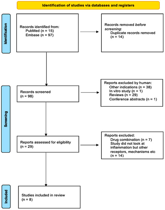 Following the search strategy, 112 studies were yielded from the databases EMBASE and PubMed. In total, 14 duplicated studies were removed via EndNote, leaving 98. Investigated other indications or conducted in vitro experiments were removed, consequently leaving 29 studies. The remaining studies were then thoroughly inspected; those that examined THC or other drug combinations or investigated inflammation were removed, leaving the records to be screened. After reading titles, abstracts, reviews, conference papers, and studies, I finally selected 8 studies that fit the criteria. Figure 4 summarizes this process via a PRISMA flow chart.