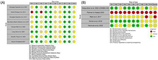 Risk of bias assessment for included studies on CBD in AD and related models. (A) Preclinical studies, with bias domains D1–D10 referring to selection, performance, detection, attrition, reporting, and other biases as defined in the key [71,72,82,83,84,85,86,87]. (B) Clinical studies, with bias domains D1–D10 covering randomization, intervention deviations, missing outcome data, outcome measurement, reporting, blinding, sample size adequacy, confounding, and protocol transparency [88,89,90,91,92]. Green circles indicate low risk of bias; yellow circles indicate unclear risk, and red circles indicate high risk.