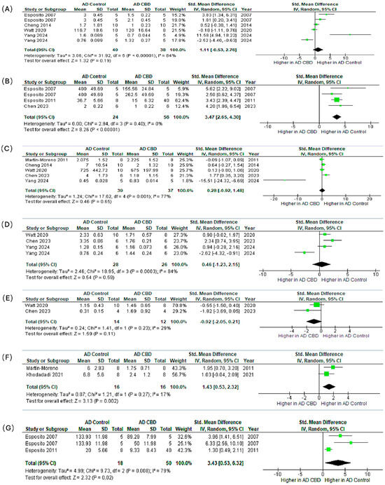 Forest plots show the standardized mean difference with 95% confidence intervals (CI) comparing CBD-treated groups versus AD controls. Each panel represents pooled effects on a specific marker: (A) IL-1β, (B) GFAP, (C) TNF-α, (D) IBA1, (E) BDNF, (F) IL-6, and (G) iNOS. Panels (B), (F), and (G) show significant reductions in GFAP, IL-6, and iNOS expression, respectively, suggesting CBD’s potential role in attenuating reactive gliosis and neuroinflammation. The remaining markers (IL-1β, TNF-α, IBA1, BDNF) show non-significant trends toward reduction. With varying degrees of heterogeneity, potentially reflecting differences in dosage, treatment duration, and model characteristics. These results support the anti-inflammatory and neuroprotective potential of CBD in AD pathophysiology.