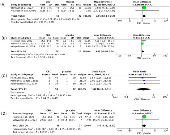 Behavioral symptoms (Figure 7A). CBD favored improvement over placebo (pooled MD = 7.85; 95% CI 0.13–15.57; p = 0.05). Hermush et al. [92] showed a 7.5-point benefit (95% CI −0.34 to 15.34); Velayudhan et al. [88] reported a larger, imprecise effect (MD = 19.72; 95% CI −25.80 to 65.24), reflecting a small sample size.