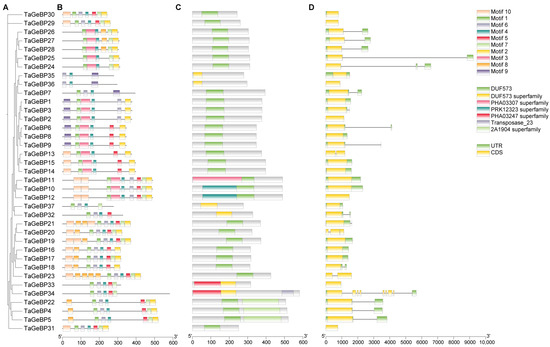 Phylogenetic relationships, motif compositions, conserved domains and coding gene structures of wheat TaGeBP proteins. (A) A phylogenetic tree corresponding to the evolution of the wheat TaGeBP gene family by the TBtools-II. (B) Conserved motifs of TaGeBP proteins. Conserved protein motifs (1–10) were identified using MEME program. Color-coded domains correspond to distinct motifs, with sequence length calibration shown by the 100-aa scale bar. (C) The distribution of conserved domains on TaGeBP proteins. (D) Exon-intron structure analysis of 37 TaGeBP genes. Exons are depicted by yellow boxes, 5′/3′ UTRs by green boxes, and introns by black lines.