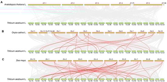 (A–C) Synteny analysis of GeBP genes among wheat, Arabidopsis, rice and maize. Gray lines represent all collinear blocks between wheat and the other three plant genomes; red lines indicate the syntenic relationships of GeBP gene pairs between wheat and other three species (rice, maize, and Arabidopsis).