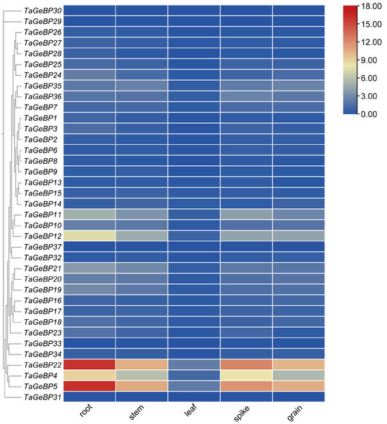 To investigate the tissue-specific expression patterns of the TaGeBP family, we retrieved RNA-seq data for all 37 TaGeBP genes across five distinct organs (leaf, root, spike, stem, and grain) of the bread wheat cultivar Chinese Spring from the WheatOmics 1.0 database. A heatmap constructed based on log2 (TPM + 1)-transformed expression values revealed substantial variations in the expression profiles of TaGeBP genes across the tested tissues (Figure 7; Table S6). Among the 37 TaGeBP members, all genes except TaGeBP29, TaGeBP30, and TaGeBP31 were expressed (TPM > 0) in all five examined tissues, indicating widespread transcriptional activity of the gene family across wheat organs.