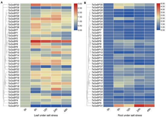 Under salt stress, in leaf tissue (Salt-Leaf, S-L), TaGeBP6 showed a higher up-regulation trend at all the times 6 h–48 h. In contrast, TaGeBP18, 31, 33, 37, 29 showed a down-regulation trend. TaGeBP24, TaGeBP25, TaGeBP9, TaGeBP10 and TaGeBP12 showed an up-regulation followed by down-regulation trend, with peak expression at 24 h, 24 h, 24 h, 24 h and 12 h, respectively (Figure 8A, Table S7). In contrast, TaGeBP13 and TaGeBP23 displayed a down-regulation followed by up-regulation pattern, reaching their lowest expression levels at 6 h post-treatment (Figure 8A). In root tissue (Salt-Root, S-R), TaGeBP31 maintained higher expression levels than the control, peaking at 24 h. Meanwhile, TaGeBP29, TaGeBP30, TaGeBP25, TaGeBP6, TaGeBP17 and TaGeBP18 exhibited an up-regulation followed by down-regulation trend, with peak expression at 6 h, 12 h, 6 h, 12 h, 6 h and 6 h, respectively (Figure 8B, Table S7).