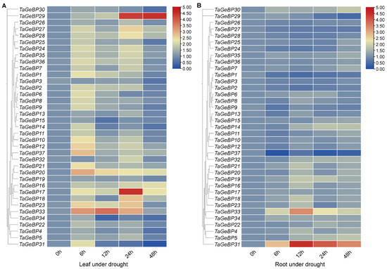 Expression analysis of 37 GeBP genes in wheat variety China Spring (CS) under drought stress via qRT-PCR. For two-leaf stage seedlings, relative expression levels in leaves (A) and roots (B) were measured at 0, 6, 12, 24, and 48 h under drought stress induced by 20% PEG6000 treatment. The expression level of each gene at 0 h was used as the reference for normalization. To visualize the expression patterns of GeBP genes with large variations in expression levels, the heatmap was generated using TBtools with the logarithmic scale (Log Scale) option enabled.