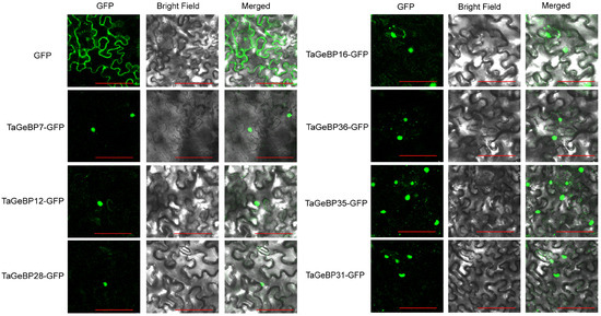 To verify whether the localizations of TaGeBPs were consistent with the predicted results, we performed subcellular localization assays using tobacco leaves. The fluorescent signals were observed 72 h after Agrobacterium injection into tobacco leaves. For the control group, fluorescence signals were detected throughout the entire cell. In contrast, the fusion proteins of most TaGeBP-GFP exhibited green fluorescent signals specifically in the nucleus, which were consistent with the predicted results (Figure 10, Table S3).