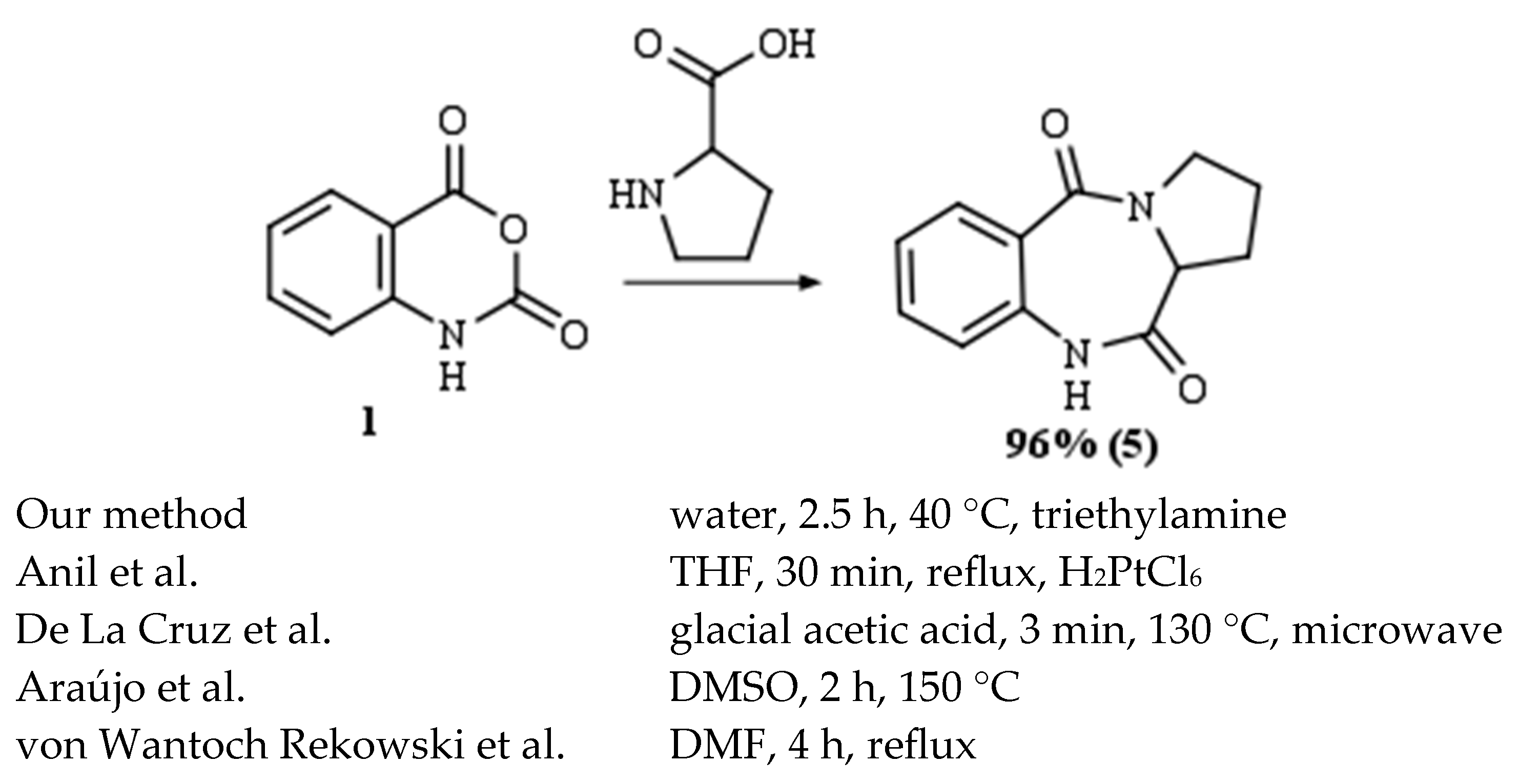 - De La Cruz, A.; Vega-Acevedo, C.A.; Rivero, I.A.; Chávez, D. Improved method for microwave-assisted synthesis of benzodiazepine-2, 5-diones from isatoic anhydrides mediated by glacial acetic acid. J. Braz. Chem. Soc. 2018, 29, 1607–1611. [Google Scholar] [CrossRef]