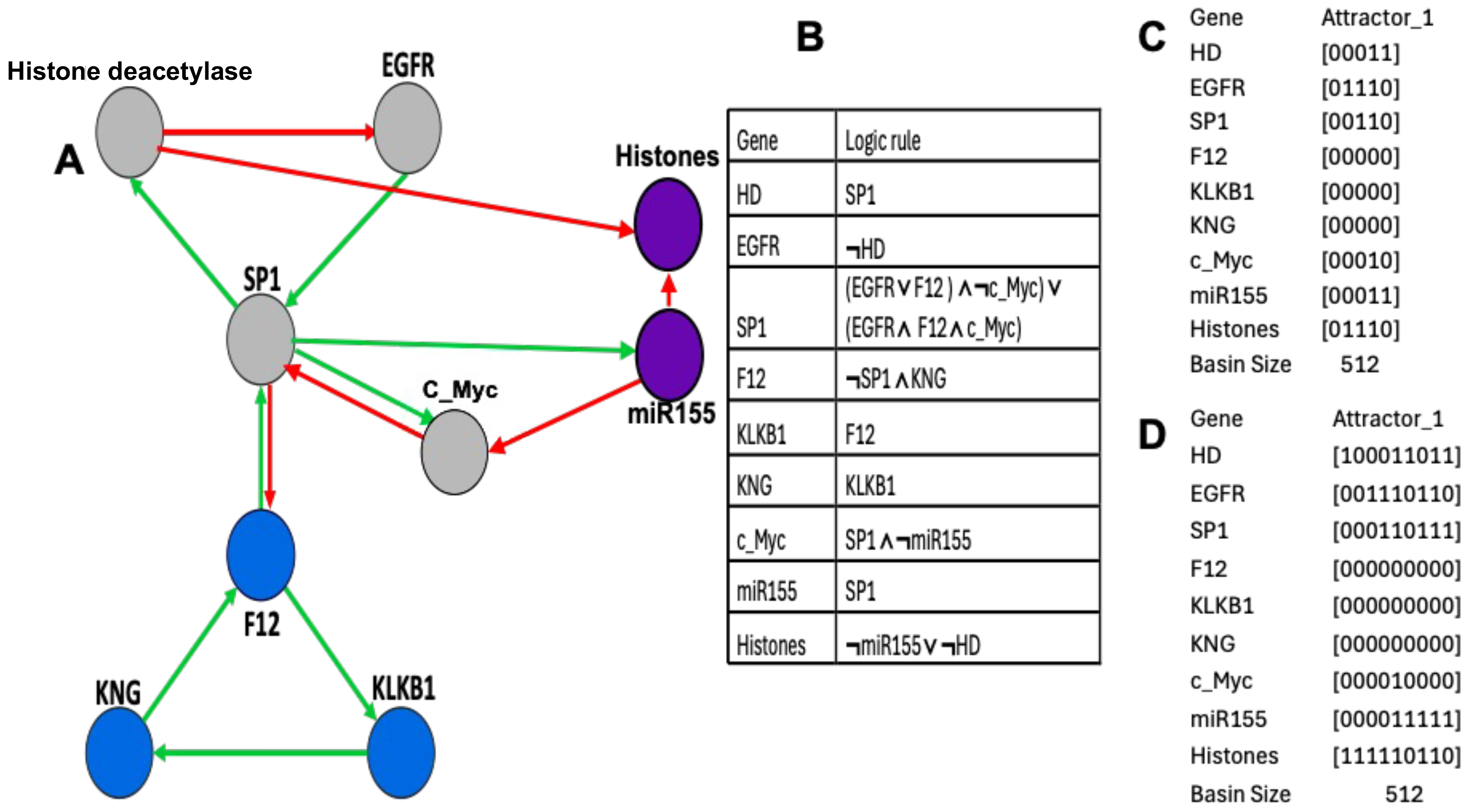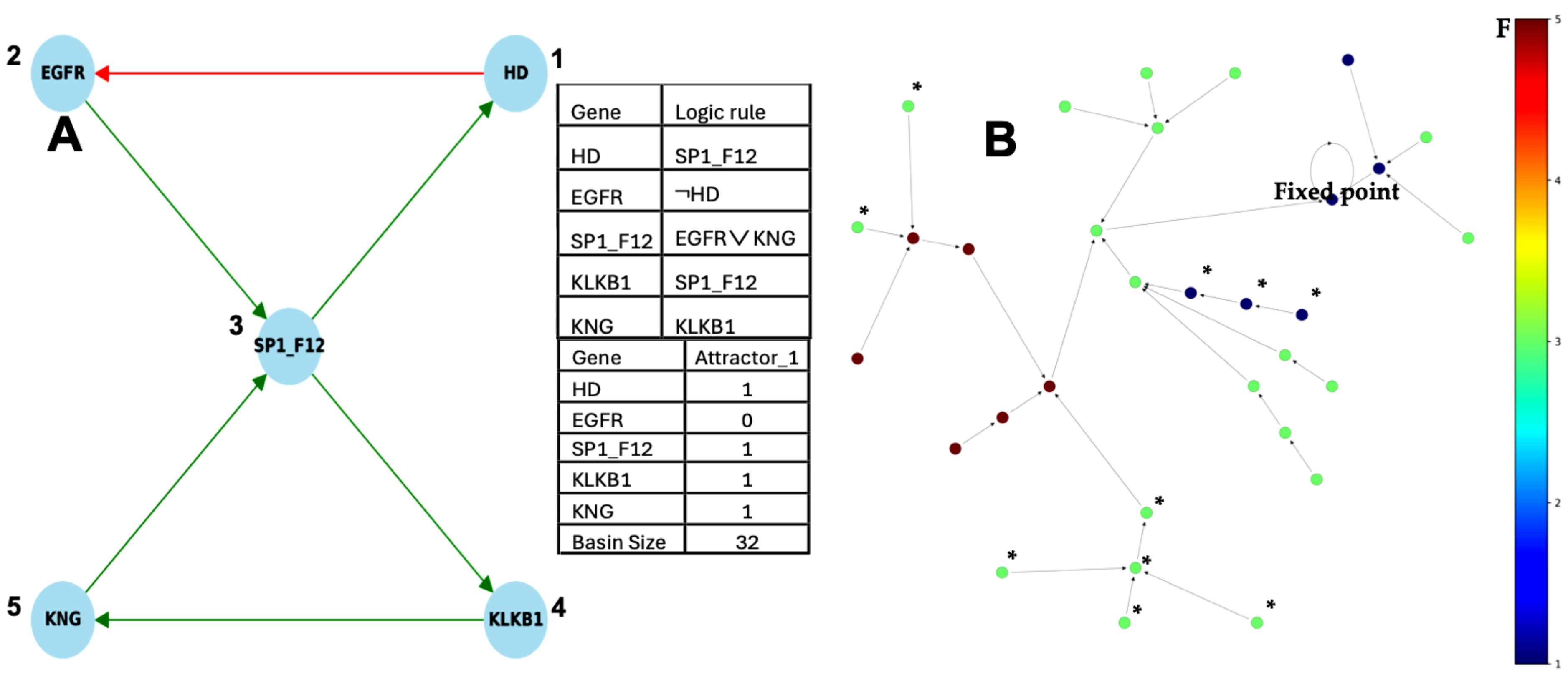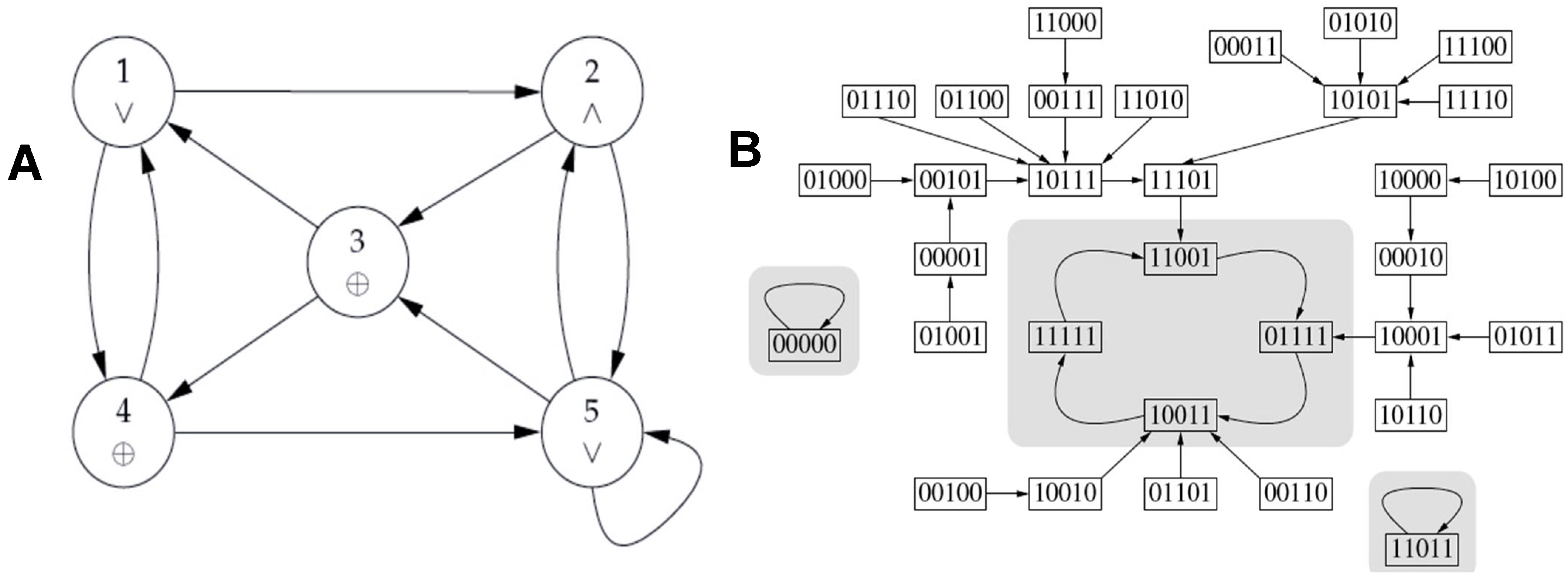 - Demongeot, J.; Goles, E.; ben Khalfallah, H.; Montalva-Medel, M.; Sené, S. Robustness of Boolean networks to update modes: An application to hereditary angioedema. arXiv 2025, arXiv:2505.14923. [Google Scholar] [CrossRef]
