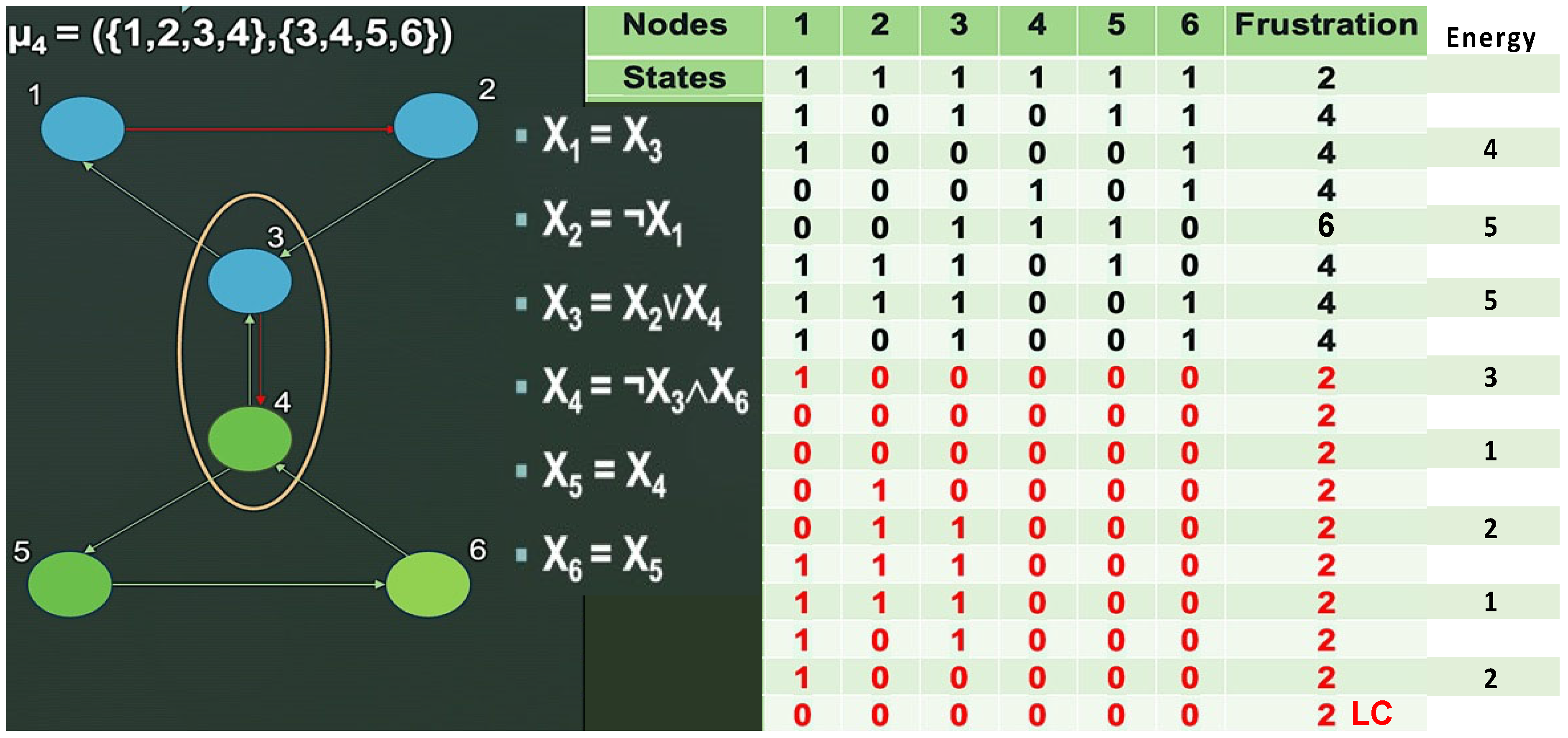 - A simulation is performed with a classical parallel updating mode and shown the presence of a single attractor, a limit cycle of length 5. Figure 11A (respectively, Figure 11B) shows the frustration (resp. energy) function on the trajectories. The basin of attraction of the configuration i of the limit cycle in Figure 11A, called the isochronal basin of i, is limited to five initial configurations rotating in phase with i on the limit cycle after one iteration.