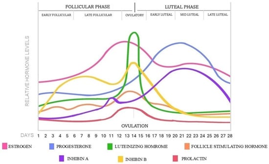 The menstrual cycle is under the coordination of the mature hypothalamic-pituitary-ovarian (HPO) axis. Puberty provokes a rise in amplitude and frequency of the pulsatile release of gonadotropin-releasing hormone (GnRH) in the hypothalamus, promoting the secretion of FSH and LH in the pituitary gland, which stimulates the development of the follicles in the ovaries and initiates the reproductive cycle [8,9,10]. The average menstrual cycle covers a 28-day period; however, it occurs at intervals of 21 to 35 days. Ovulation halves the ovarian cycle, dividing it into follicular and luteal phases; however, according to the hormonal changes, the two main phases can be further divided into subphases as early and late follicular and early, mid, and late luteal phases [11,12]. During the menstrual cycle, the GnRH pulses determine the hormonal levels by positive and negative feedback regulatory mechanisms, which become more frequent in the follicular phase and ovulation, then decrease in the luteal phase [13]. The hormonal changes in each menstrual phase are represented in Figure 1.