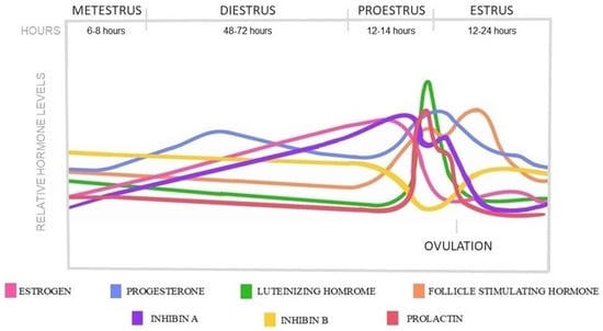 The estrus cycle begins with the proestrus phase, which lasts 12–14 h. During this time, follicles go through the same maturation stages as humans, showing similar gonadotropin dependence in the antral stages. As the dominant follicles are selected, estrogen is secreted, reaching a pre-ovulatory peak which contributes to the rise of LH and FSH concentrations. At the same time, progesterone and prolactin levels also rise, creating similar pre-ovulatory peaks that coincide with the LH surge [15,30,31,32,33]. The sharp LH peak, with the drop of estrogen and progesterone, triggers ovulation at the beginning of the estrus phase. Ovulation happens 10–12 h after the LH peak. The inhibin A level is higher before ovulation than after, while B falls below its baseline level around the period of ovulation [34]. The length of the estrus phase is 24–48 h when the ruptured Graafian follicles start to transform into corpora lutea, accompanied by a decrease in estrogen, LH, FSH, and prolactin levels [11]. The newly formed corpora l-tea show high steroidogenic and low luteolytic gene expressions, thereby secreting progesterone for a short period from nearly the end of estrus and during the 6–8 h lasting metestrus phase [35,36]. After the short metestrus, the luteolytic genes become predominant, and the corpora lutea begin to regress through luteolysis in the following diestrus phase, which lasts 48–72 h [11,37,38]. The progesterone level started to decrease as the corpora lutea regressed in the absence of prolactin [39]. At the end of di-estrus, the cycle starts over; however, the luteal regression process of copora lutea is prolonged over several estrus cycles [11,36,40].