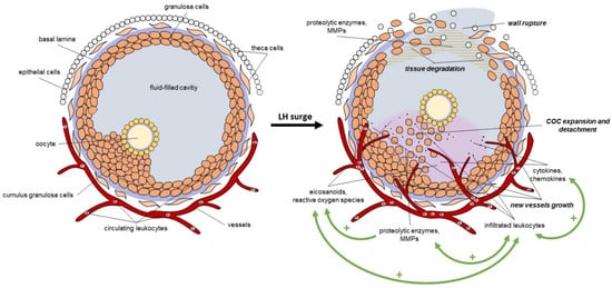 Most of the processes involved in follicle rupture are coordinated by inflammation and oxidative events upon LH stimulation. Granulosa and theca cells express abundant LH receptors; therefore, they are the first to respond to the LH stimulus. By the stimuli, they release several proteolytic enzymes, including matrix metallopeptidases (MMPs), which induce the fragmentation of the collagenous matrix and disrupt the basal lamina of the extracellular matrix (ECM). As the basal lamina degrades, new vessels grow into the granulosa compartment. In parallel, granulosa and theca cells started to form site-acting agents like eicosanoids and reactive oxygen species; moreover, they secrete cytokines (interleukins (IL, including IL-1β, IL-6), tumor necrosis factor-alfa (TNF-α) and chemokines, which initiate the infiltration of the circulating leukocytes into the follicle [44,45,46,47]. The infiltrated leukocytes also secrete cytokines, chemokines, and proteases; moreover, they also produce eicosanoids and free radicals to further induce the progression of inflammation and ECM degradation. The cumulus granulosa cells also secrete these inflammatory and oxidative mediators, which induce cumulus expansion and contribute to the detachment of the cumulus oocyte complex (COC) from the basal granulosa cells [47,48]. The loss of the granulosa and theca cells at the apical site of the follicle opens the wall and leads to the follicle rupture and the release of the oocyte [44,47]. These processes induce a self-generating inflammatory cascade reaction with several positive feedback loops, which amplify the LH stimulus and lead to a local and acute inflammation in the ovary during ovulation (Figure 3).