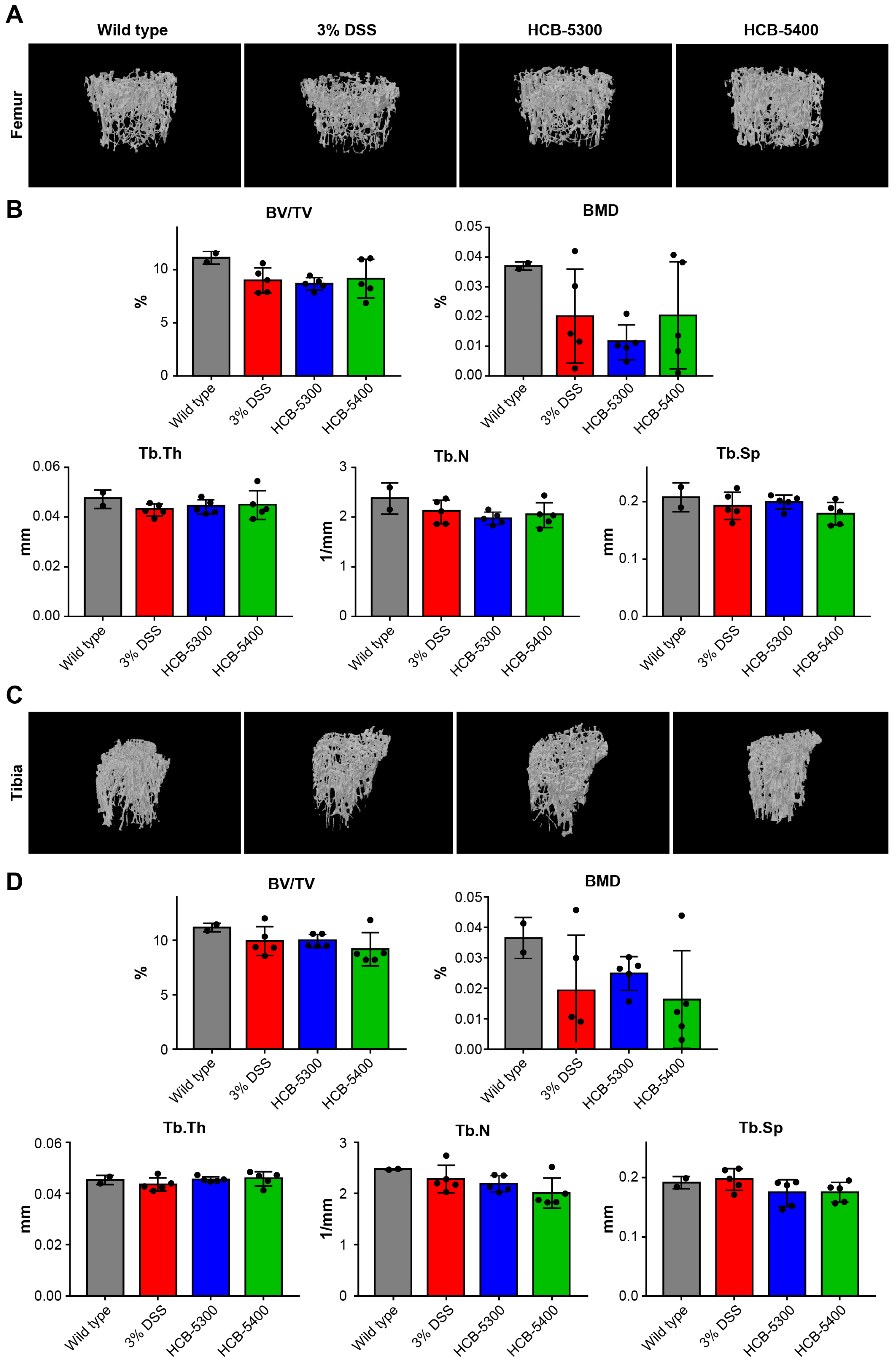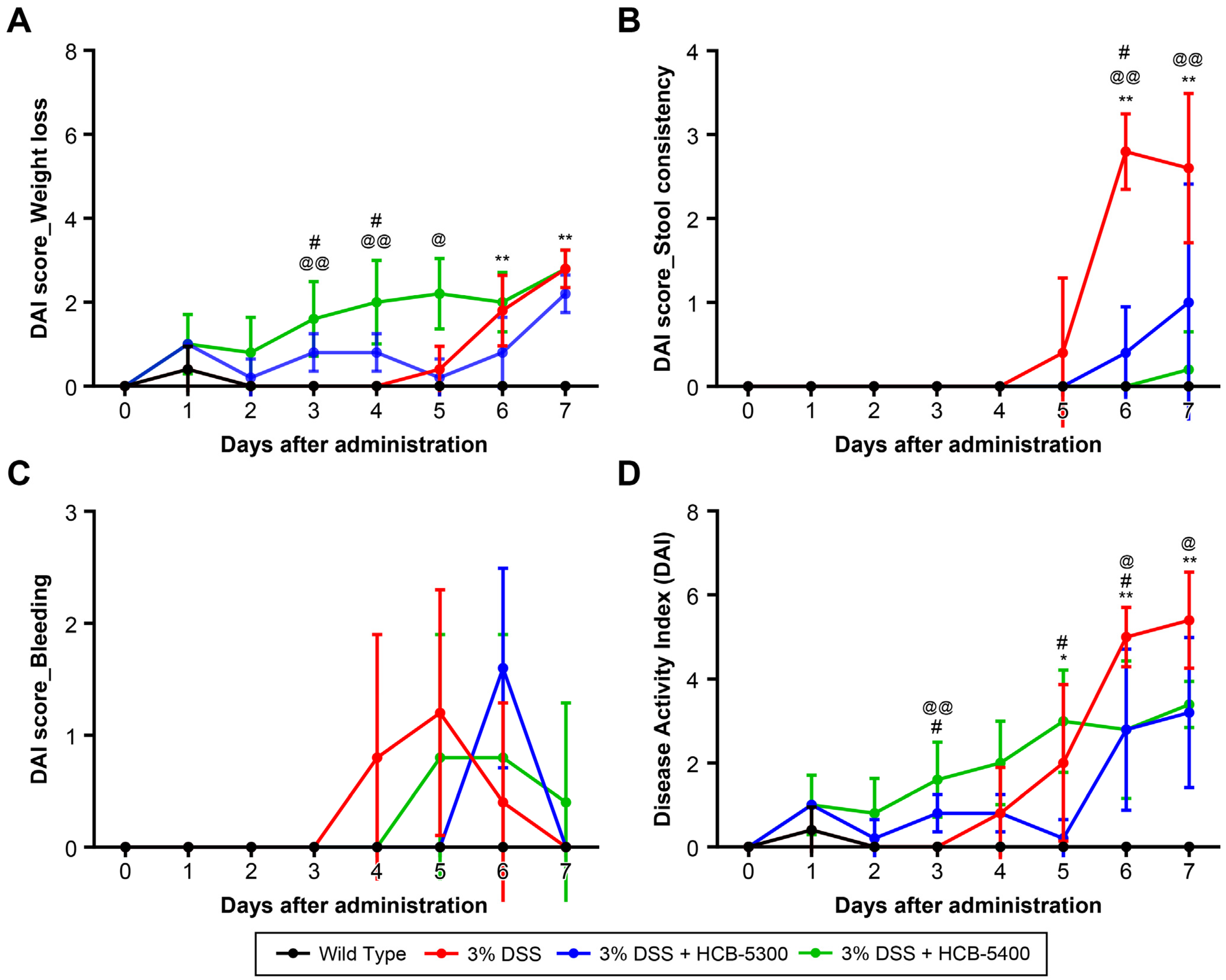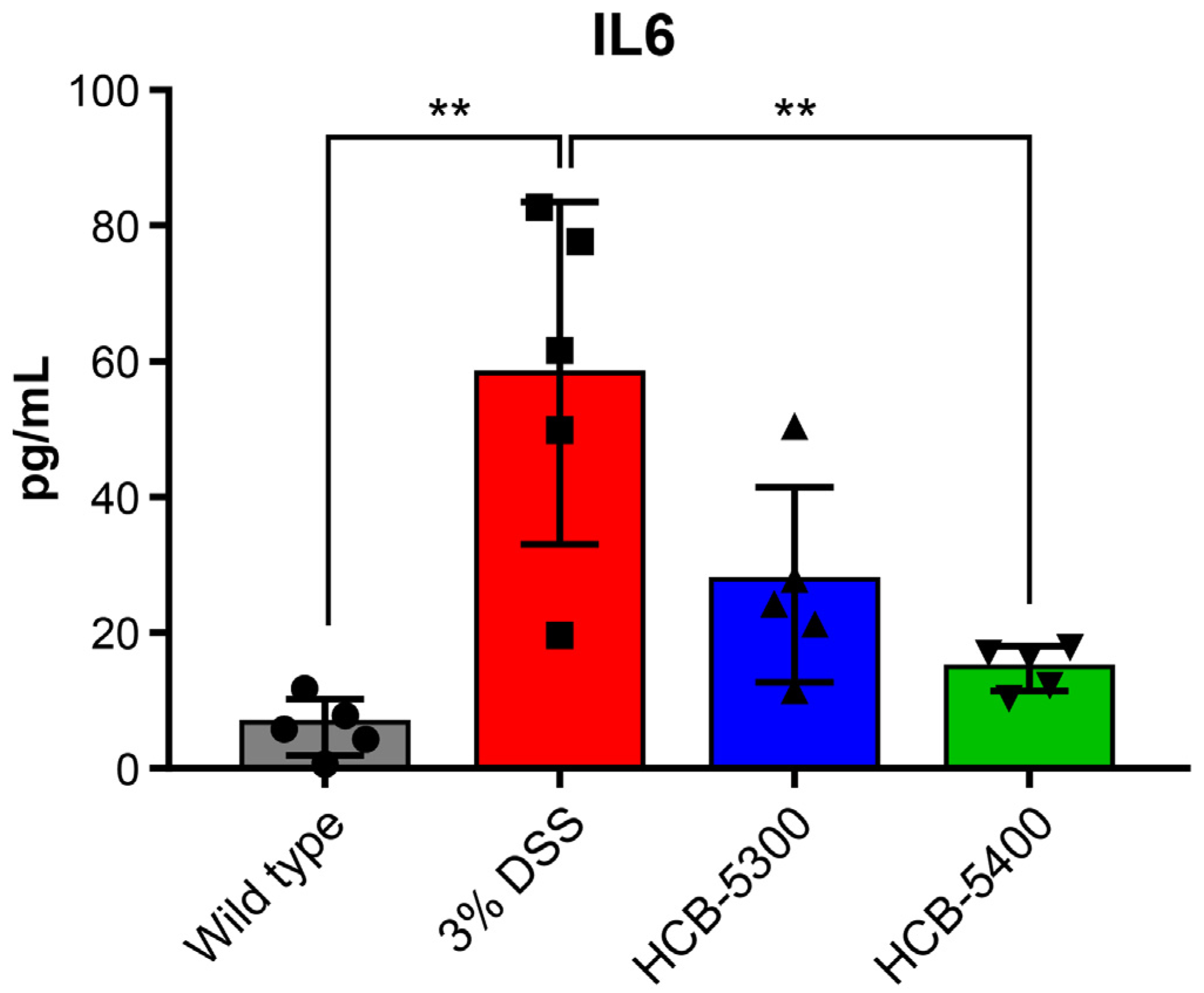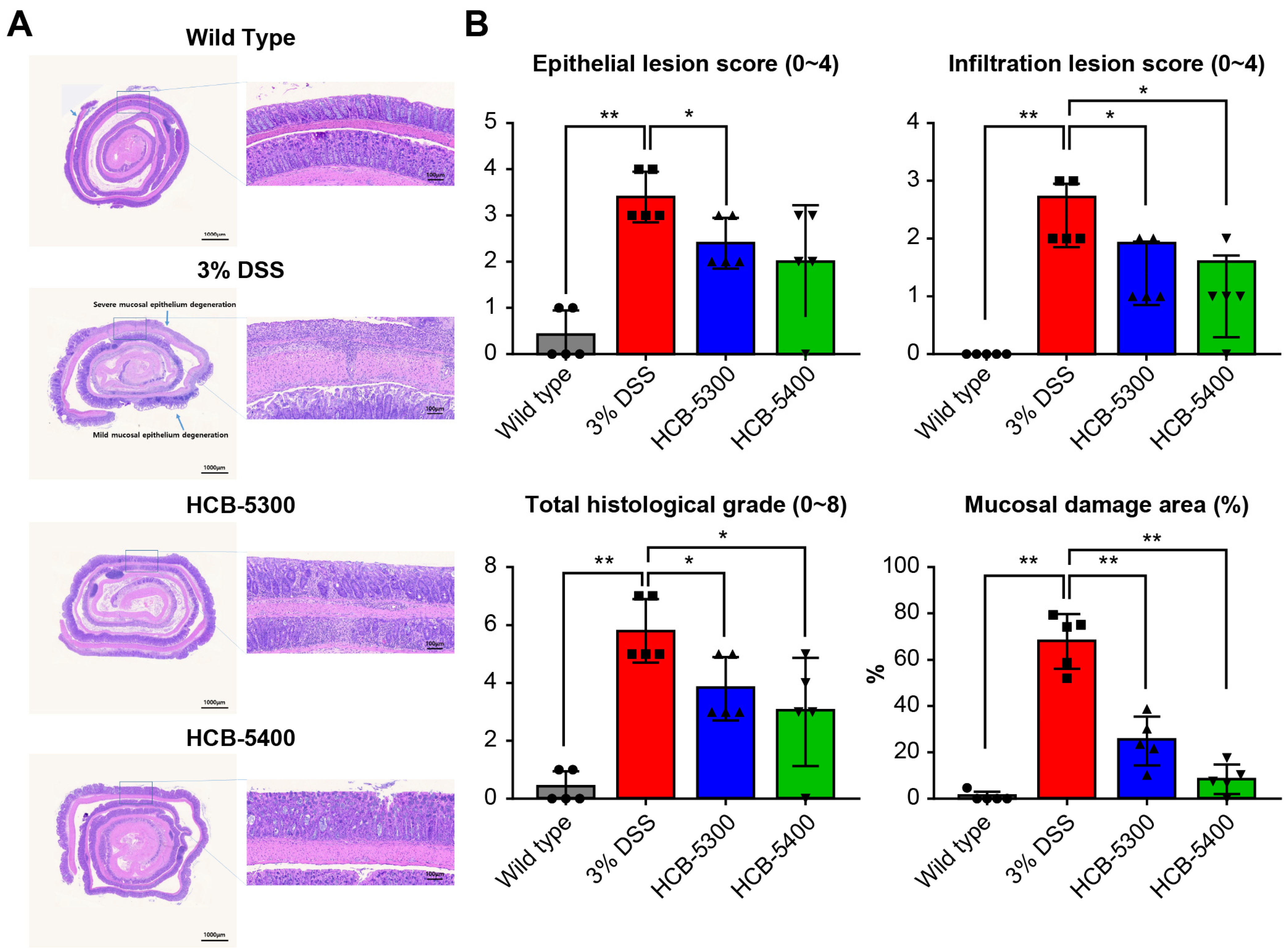 2.3. Therapeutic Effects of HCB-5300 and HCB-5400 on DSS-Induced Colitis