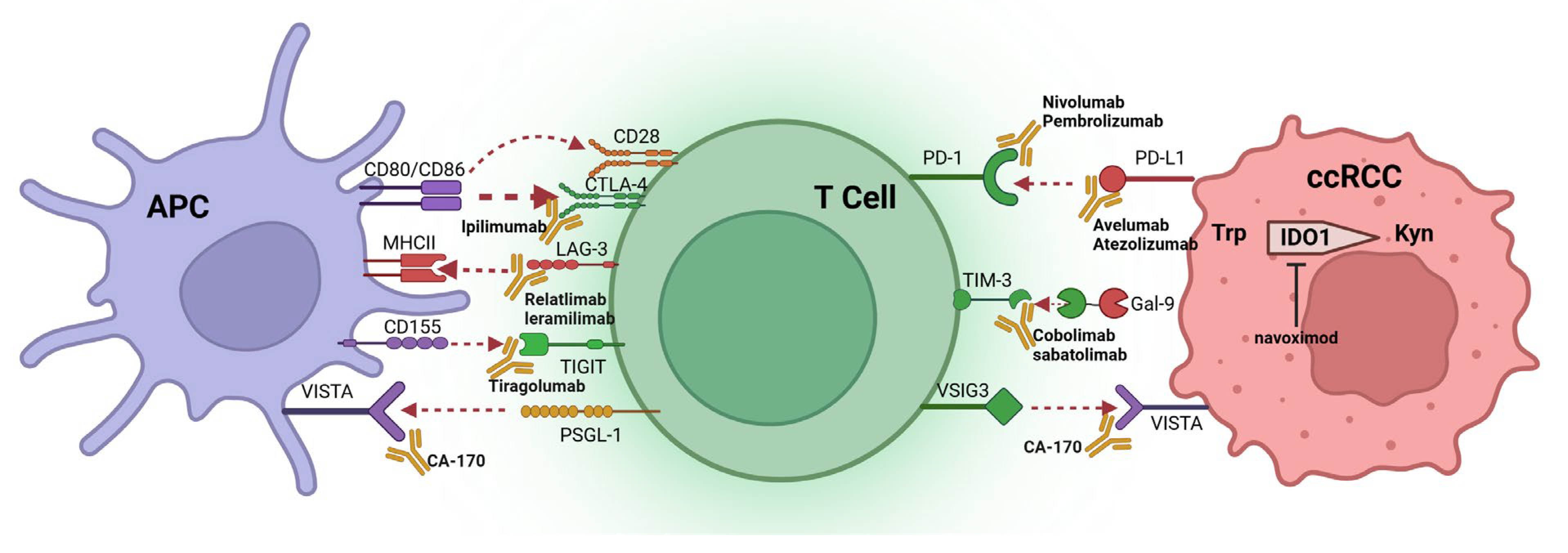 - TIGIT (an inhibitory receptor) expression occurs mainly in activated CD8+ or CD4+ T cells, Tregs, and NK cells [94]. CD155, CD112, and CD113 (TIGIT ligands) expression occurs in APCs. CD155 demonstrates the highest affinity for TIGIT among these ligands. TIGIT binding to ligand alters APC function and reduces cytokine release which results in diminished T cell activation [95]. Studies have shown that TIGIT is expressed on exhausted CD8+ T cells, and detected in peripheral blood mononuclear cells, and TILs in ccRCC patients [96].