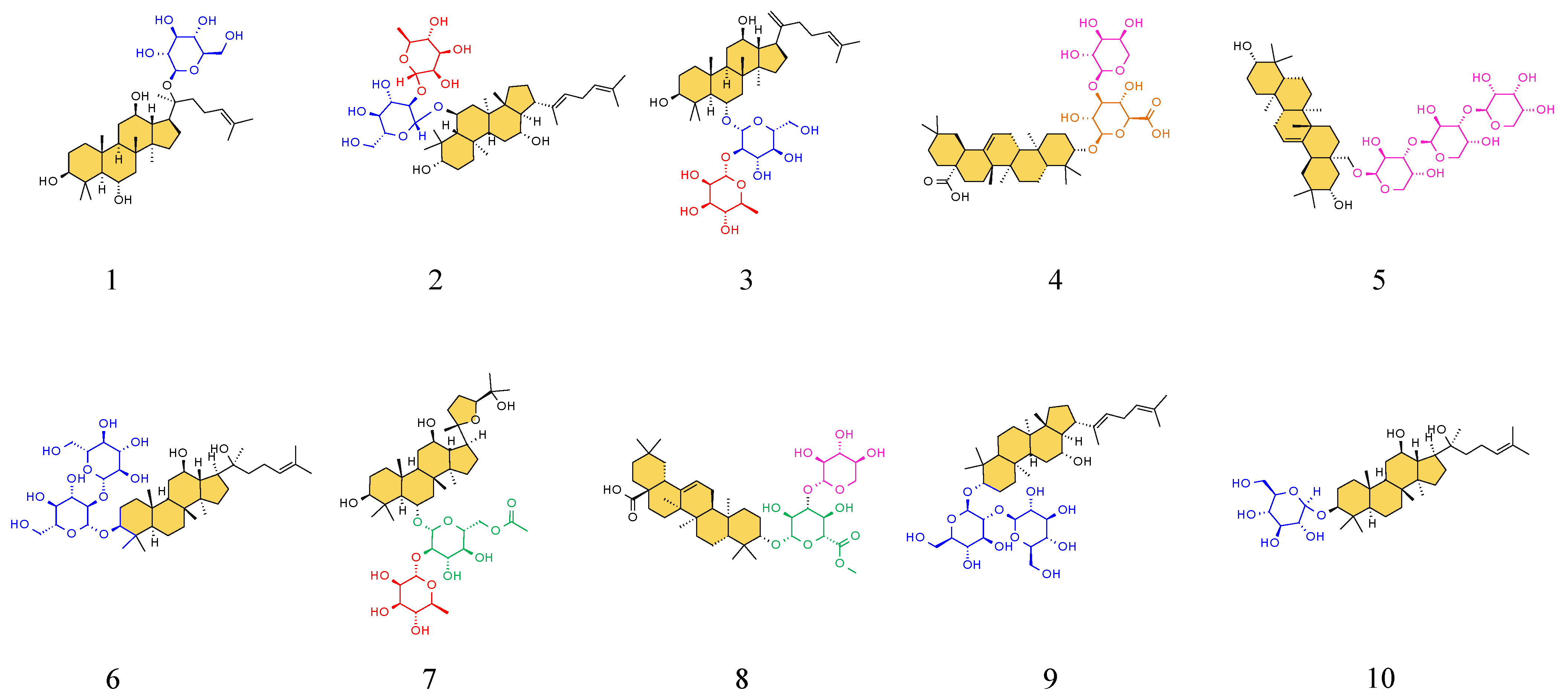 - Metwaly, A.M.; Zhu, L.; Huang, L.; Dou, D. Black Ginseng and Its Saponins: Preparation, Phytochemistry and Pharmacological Effects. Molecules 2019, 24, 1856. [Google Scholar] [CrossRef]