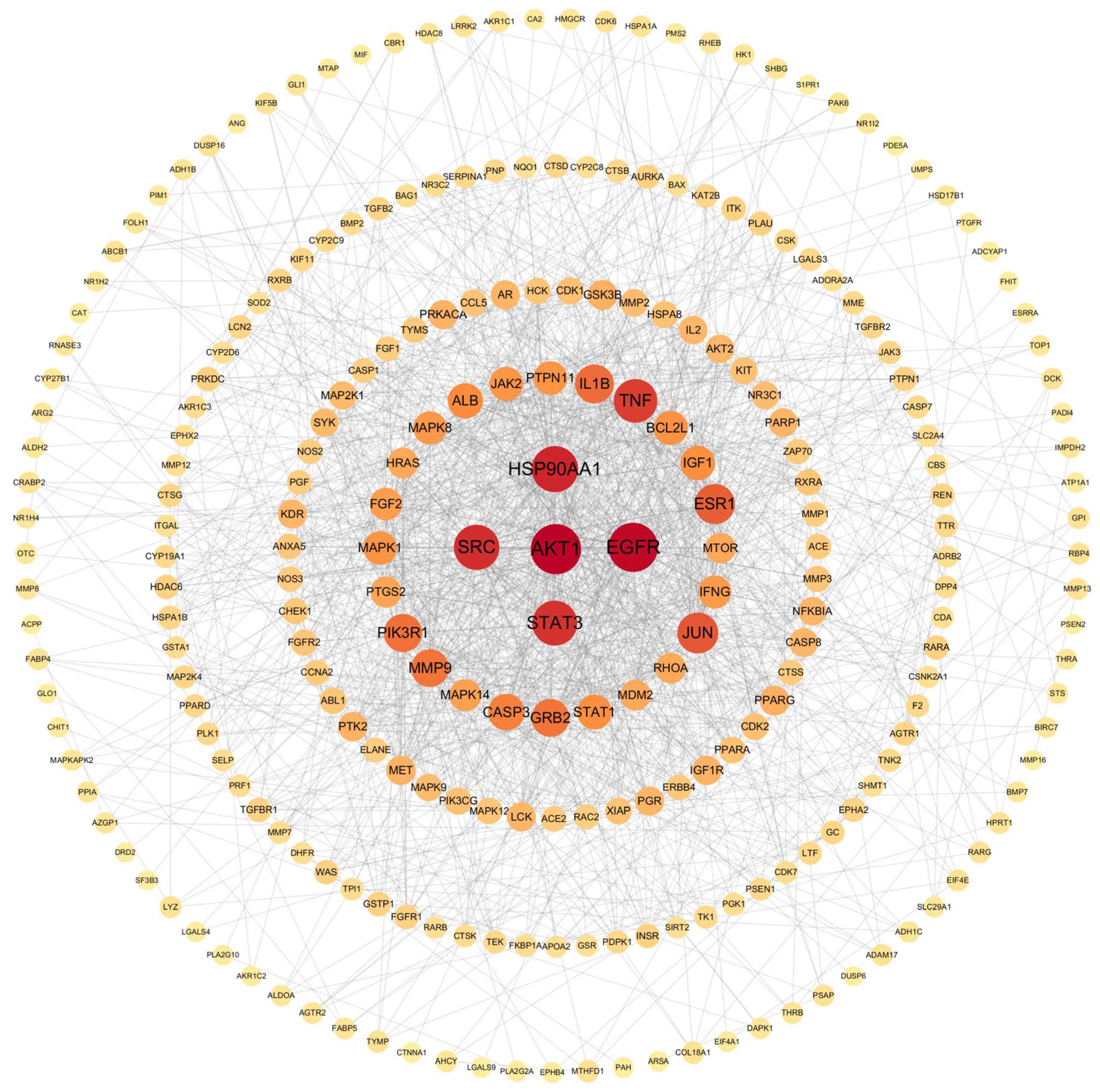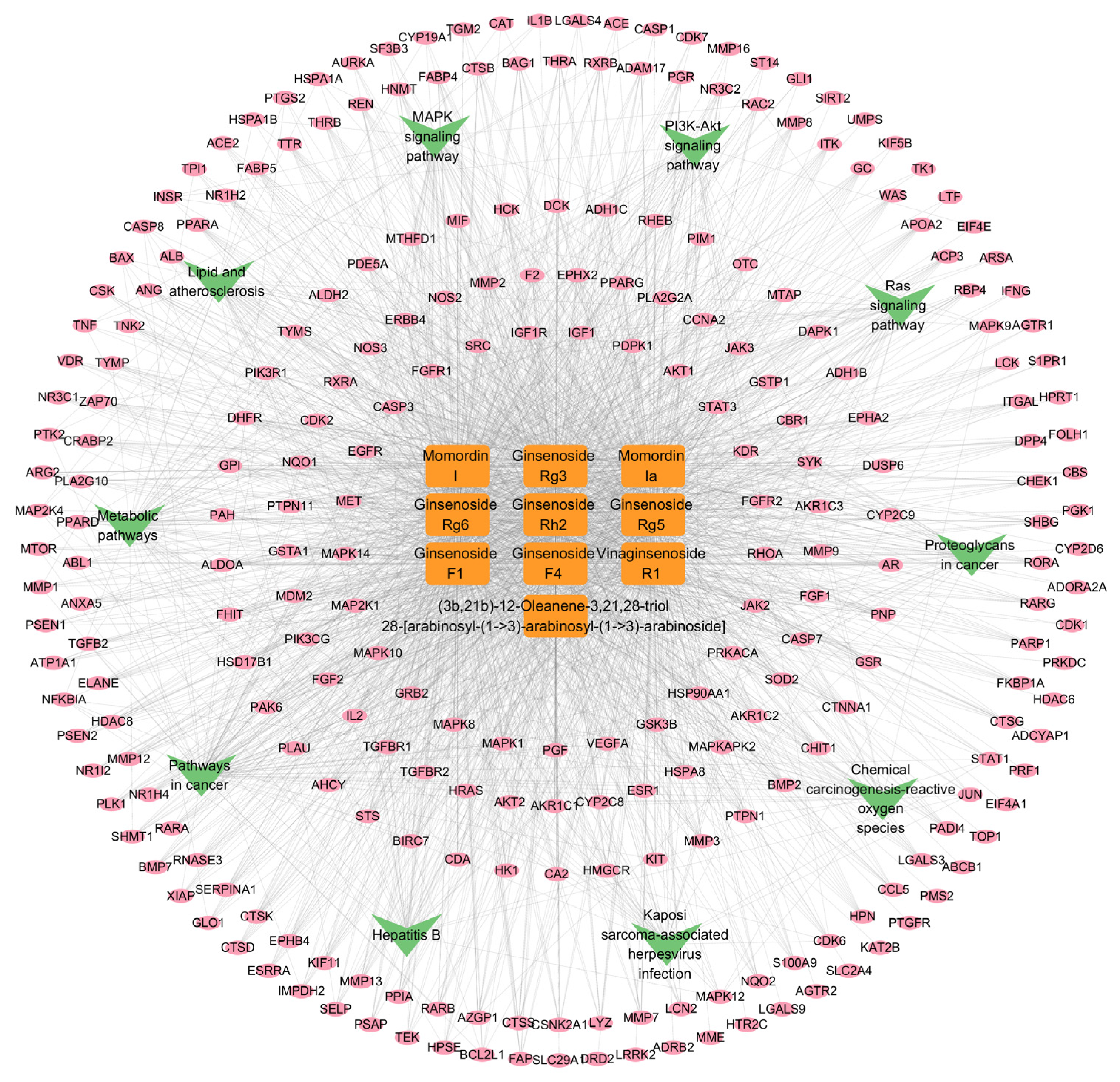 4.3.6. Construction of the Compound-Target-Pathway Network