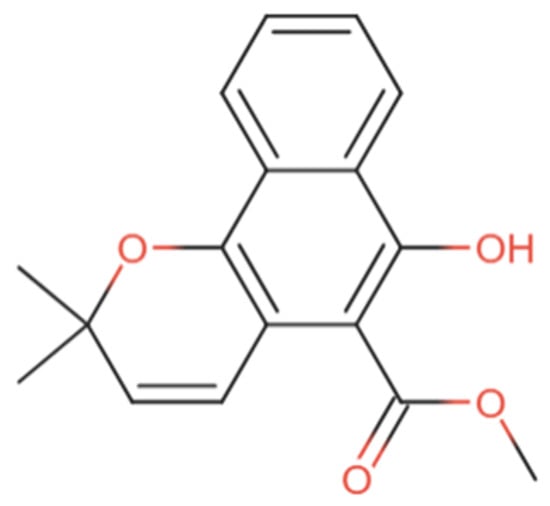 The chemical structure of mollugin is presented in Figure 1. Mollugin, chemically methyl 6-hydroxy-2,2-dimethylbenzo[h]chromene-5-carboxylate, also known as rubimaillin, is a benzochromene derivative with a dimethyl group at the 2-position, a methoxycarbonyl group at the 5-position, and an OH group at the 6-position [8].