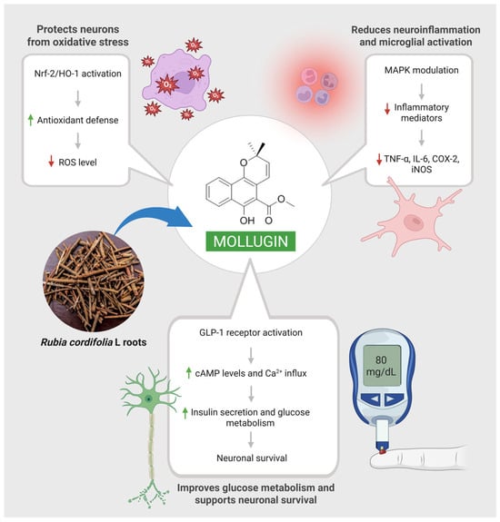 Furthermore, an in vivo mice model of type 2 diabetes (T2DM) supports its neuroprotective role by showing a notable improvement in cognitive impairment. It binds to glucagon like peptide 1 receptor (GLP-1R), elevates cAMP levels, enhances insulin secretion, and increases Ca2+ influx in the β-TC-6 cell line. Moreover, mollugin alleviates neuronal cell damage, reduces PIK3CA, AKT1, and MAPK mRNA expression in the brain cortex tissue, and shortens the latency to the platform in the Morris water maze test performed in T2DM mice [48]. All these results demand further in-depth exploration of mollugin which could establish it as a promising therapeutic agent for neurogenerative diseases. Findings from this study demonstrate that mollugin promotes cognitive performance through the regulation of the GLP-1R and PI3K/Akt signaling pathways. Still, further long-term in vivo studies are needed to establish reproducibility and clinical relevance. The neuroprotective role of mollugin is demonstrated in Figure 4.