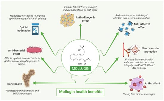 In silico pharmacogenomics analysis, conducted recently in 2024, identified 10 chemicals that interact with the key genes involved in opioid response and pain management. The principal genes involved are ABCB1, BCL2, CYP1A2, KCNH2, PTGS2, and DRD2 which may potentially regulate the physiological effects of opioids in the body. Additionally, PTGS2 and DRD2 could also modulate pain-processing pathways. Out of the ten chemical compounds analyzed, rubimaillin was found to interact with two of the previously mentioned genes. Protein chemical interaction analysis confirmed that rubimaillin interacts with the ABCB1 gene; the other gene involved in the interaction remains uncertain. The ABCB1 gene encodes P-gp, which is found in the blood–brain barrier and pumps drugs and harmful compounds out of brain. This gene modulation may reduce drug efficacy or increase drug accumulation in brain. The influence of rubimaillin on ABCB1 is unclear; the inhibition of ABCB1 might lead to an increased opioid concentration in the brain which also raises concerns about adverse effects. Conversely, the upregulation of ABCB1 may reduce drug efficacy. Understanding this interaction will provide further insight into personalized pain management treatment. Determining the influence of rubimaillin is crucial to understanding whether it can be offered as an alternative or can be an adjunct that can modulate opioid efficacy or reduce adverse effects. More clinical validation is needed to identify the influence of rubimaillin on the ABCB1 gene [73]. The health benefits of mollugin are summarized in Figure 5.