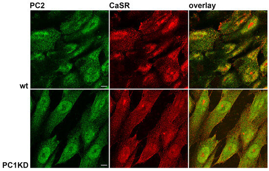 Immunofluorescence localization of endogenous CaSR and PC2 in PTEC wt and PC1KD. Overlay of the two immunostaining pictures demonstrates that the two proteins co-localize in both cell lines (scale bars: 10 μm).