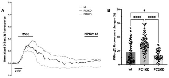 The depolarization was evaluated by single-cell epifluorescence imaging and expressed as percentage of the fluorescence increment from the basal value, registered before the stimulus, to the peak. Interestingly, PC2KD cells showed an even lower depolarization with respect to wt or PC1KD cells (13.6 ± 0.8%, n = 84, p < 0.05 vs. wt, p < 0.0001 vs. PC1KD) (Figure 4B). The specific role of CaSR activation in inducing plasma membrane depolarization was confirmed by control experiments stimulating PTEC wt, PC1KD or PC2KD with the specific CaSR antagonist, the calcilytic NPS2143, which had no effect on membrane potential (Figure 4A).