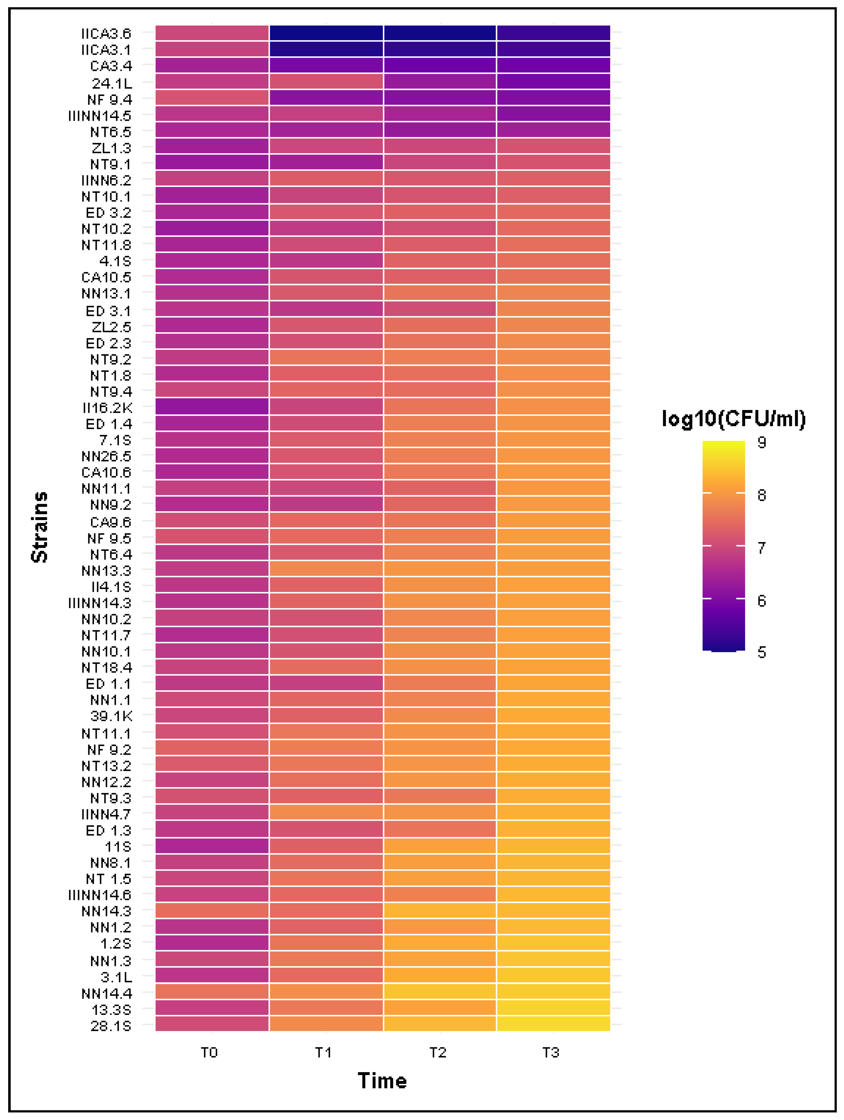 | Median CFU/mL | 2.19 × 107 | 5.56 × 107 | 1.33 × 108 | |