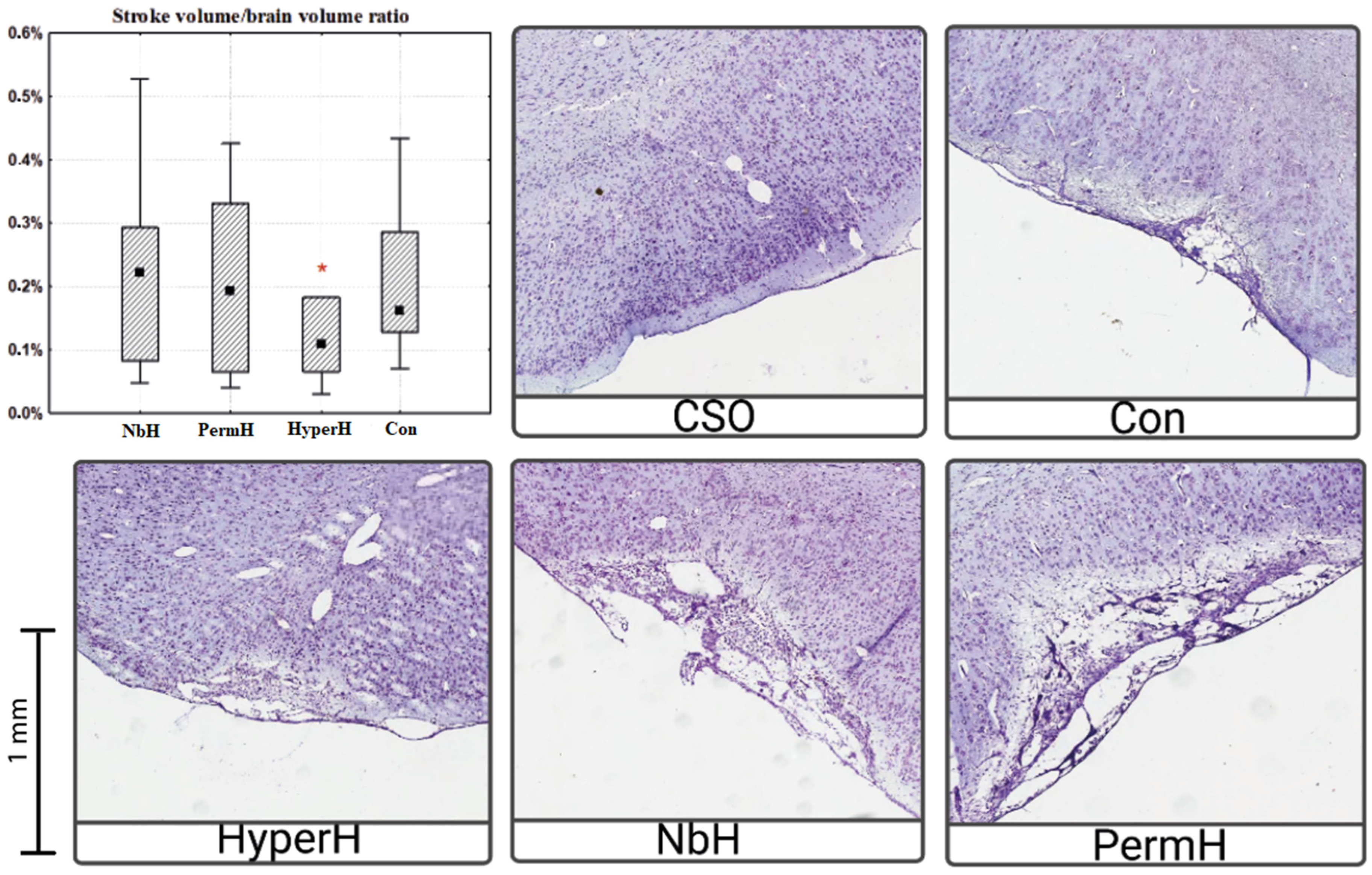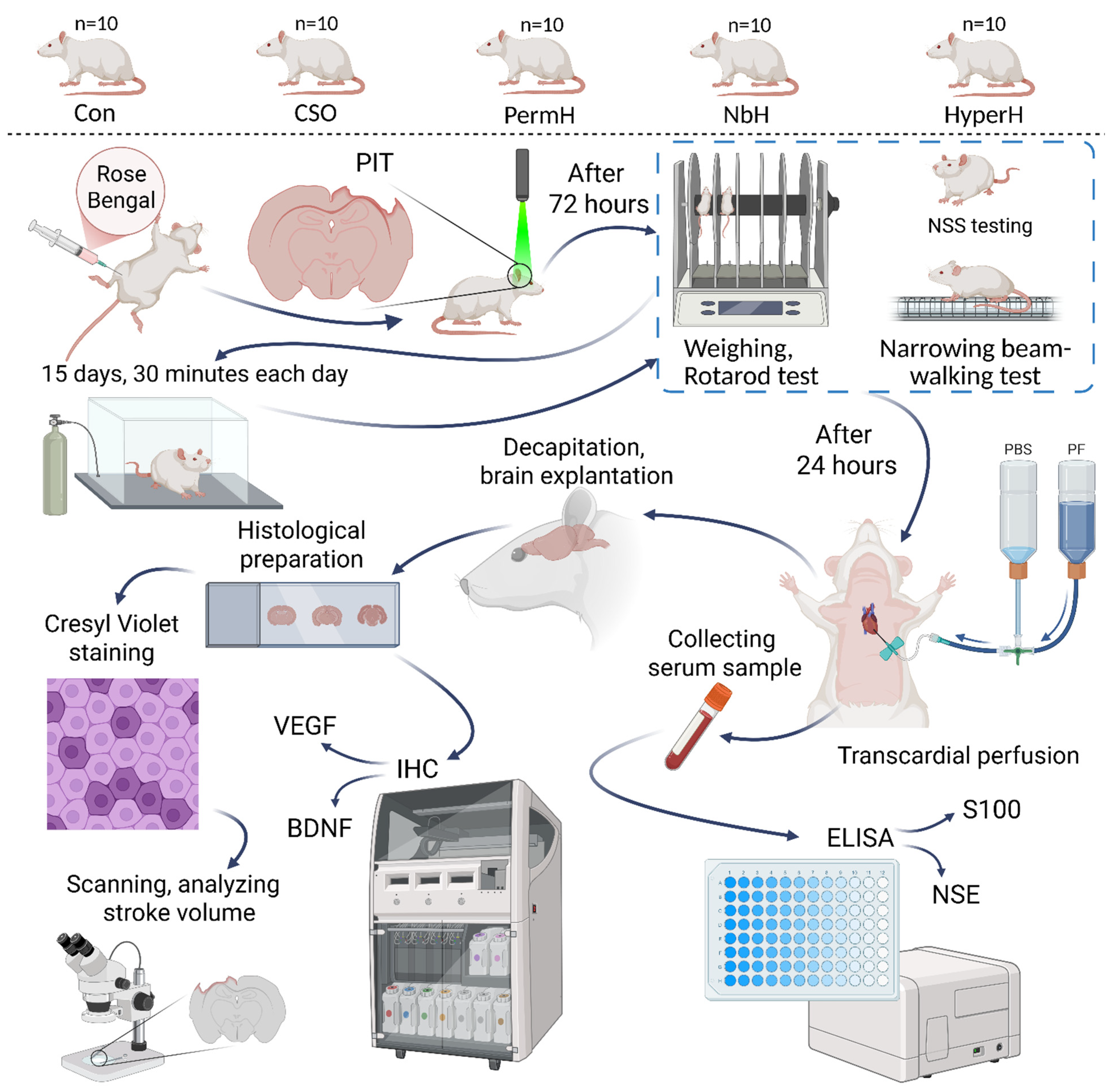 - CSO (control, sham-operated): PO2 ≈ 150 mmHg, PCO2 ≈ 1 mmHg, and balance—N2. These animals underwent all procedures but received an injection of saline instead of Rose Bengal, thus not undergoing photochemically induced thrombosis (PIT); therefore, ischemia was not induced in this group. Animals breathed atmospheric air. The CSO group serves as an additional control of normal rat neural tissue during histological evaluation, immunohistochemical analysis, and behavioral testing.