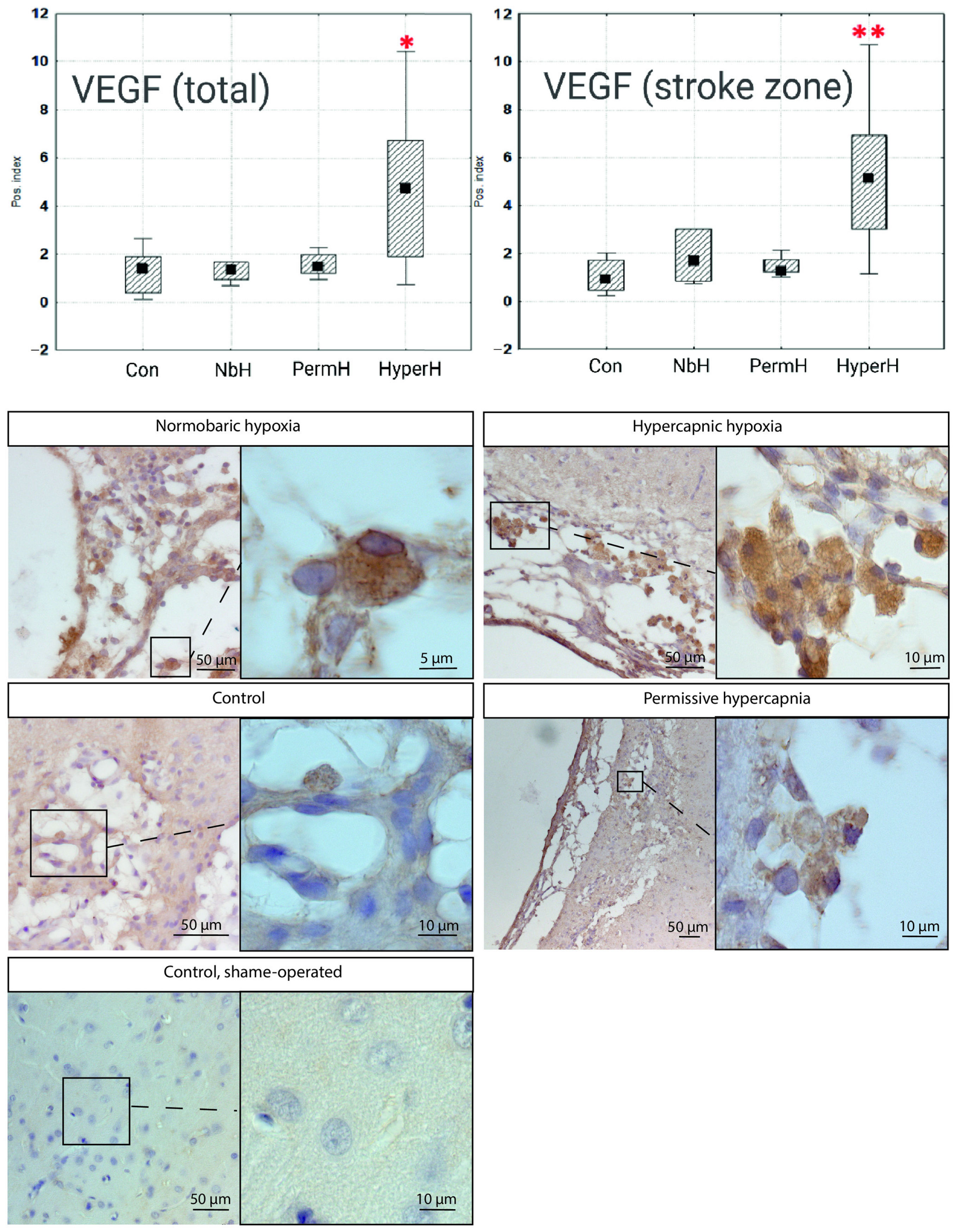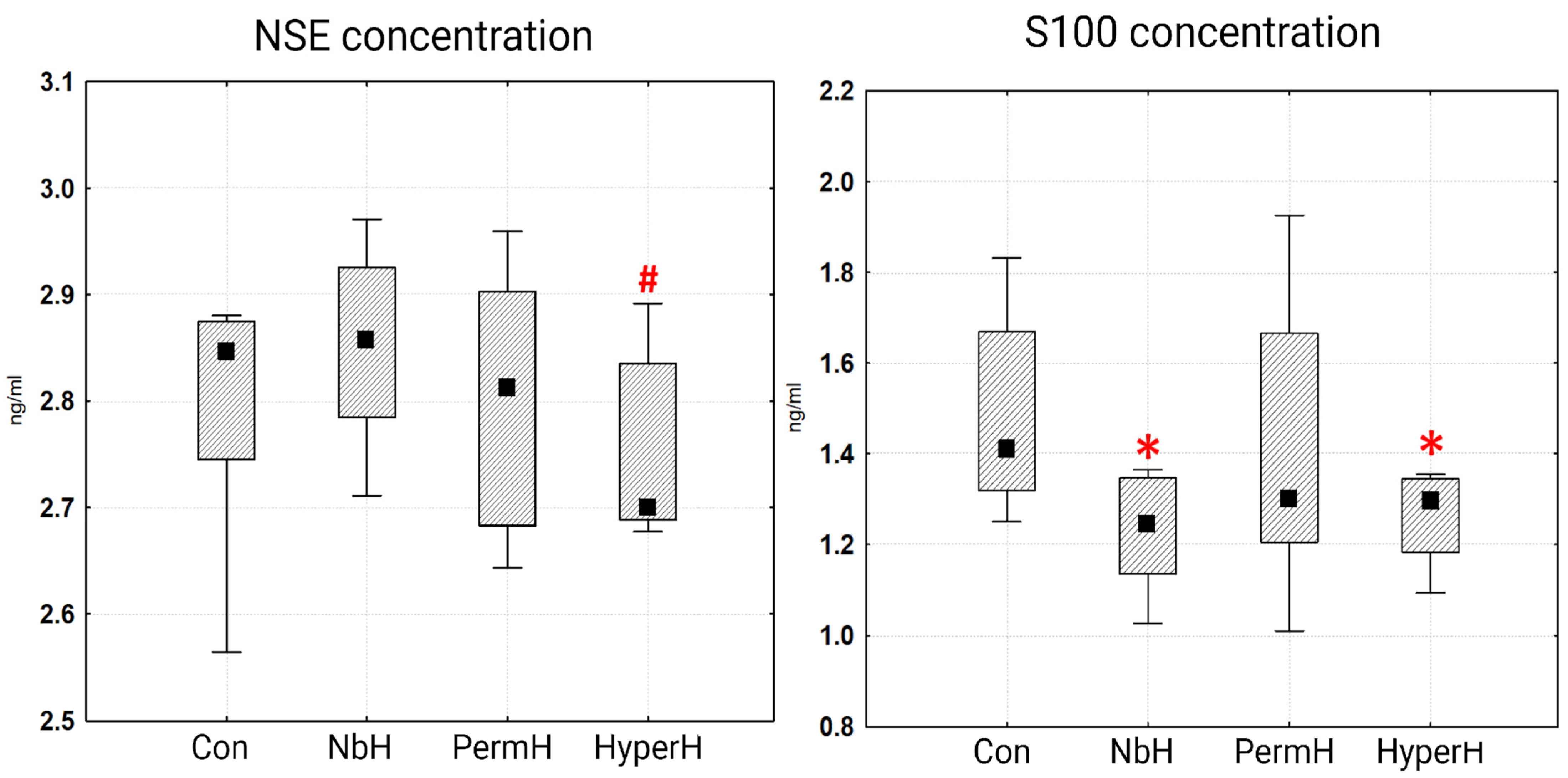 - Bespalov, A.G.; Tregub, P.P.; Kulikov, V.P.; Pijanzin, A.I.; Belousov, A.A. The role of VEGF, HSP-70 and protein S-100B in the potentiation effect of the neuroprotective effect of hypercapnic hypoxia. Patol. Fiziol. Eksp. Ter. 2014, 2, 24–27. (In Russian) [Google Scholar]
