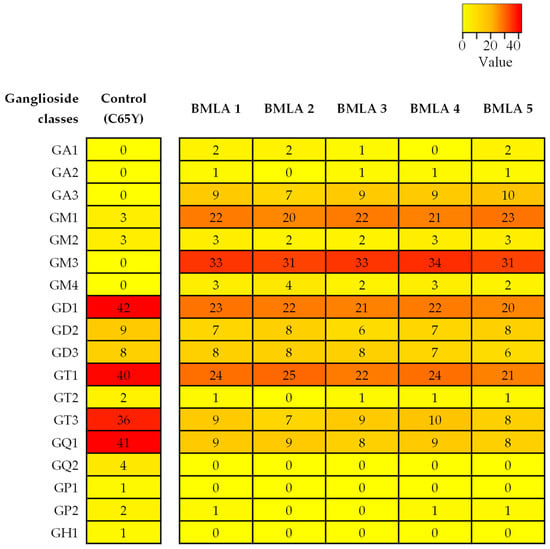 Heatmap of ganglioside expression profiles in BMLA. The heatmap illustrates the number of ganglioside (GG) species identified in five BMLA tissue samples and in the C65Y control. Each row corresponds to a GG class, and each column to a tissue sample. Numerical values inside the heatmap represent the exact count of detected GG species for the corresponding class and sample. No normalization was applied. The color gradient bar indicates the relative number of GG species identified across the dataset. Red represents classes with a higher number of detected species, while yellow represents classes with fewer detected species. Lower color intensity corresponds to lower number of identified species.
