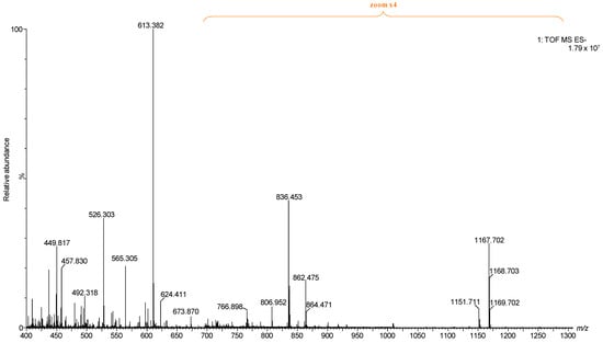 Both MS and MS/MS experiments were performed in negative ion mode, within the mass range of 400–2500 m/z, at a scan rate of one scan per second, over a two-minute infusion period for each sample. The voltage applied to the platinum wire and the cone was carefully optimized to ensure efficient ionization of the components while minimizing in-source fragmentation. A stable and constant spray was achieved with a capillary voltage of 1.5 kV and a cone voltage of 45 V. Other ionization parameters were set as follows: source block temperature at 100 °C, desolvation gas flow rate at 800 or 100 L/h, and desolvation temperature at 150 °C.